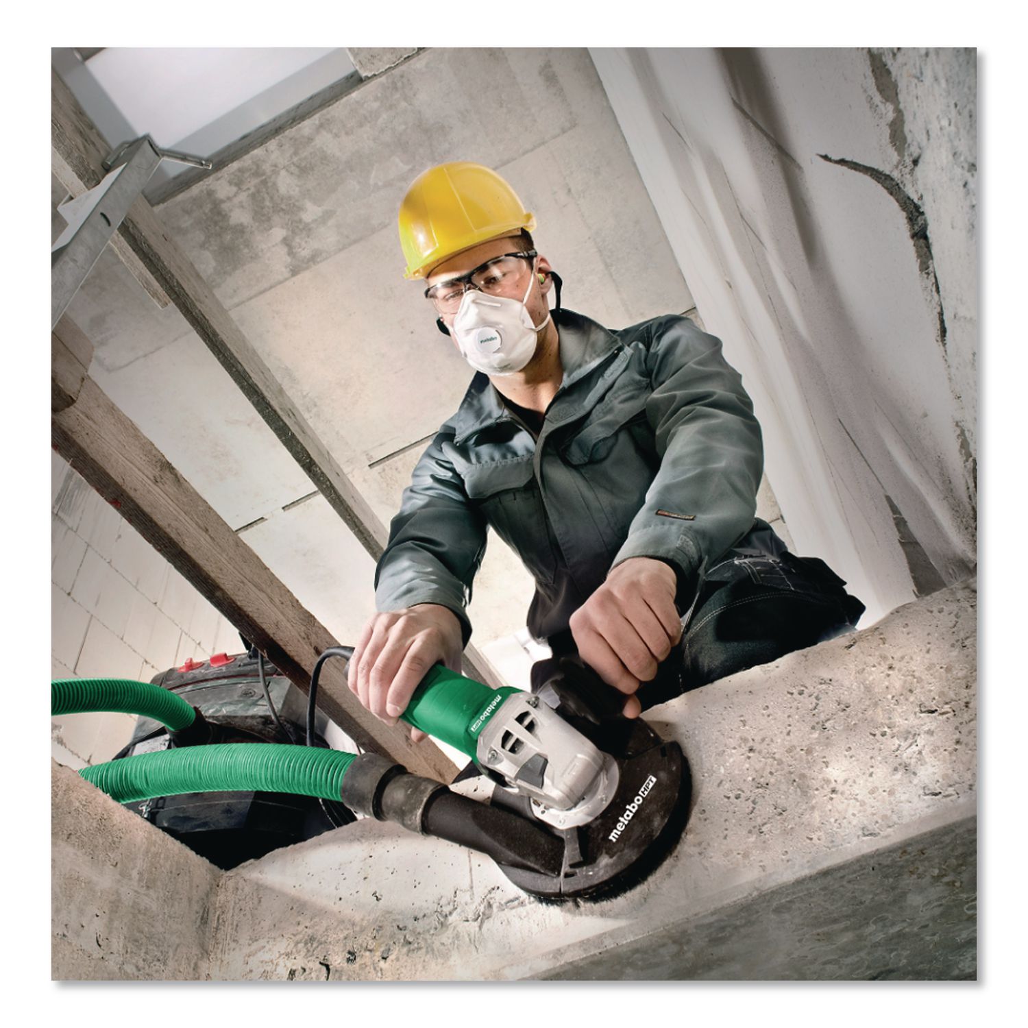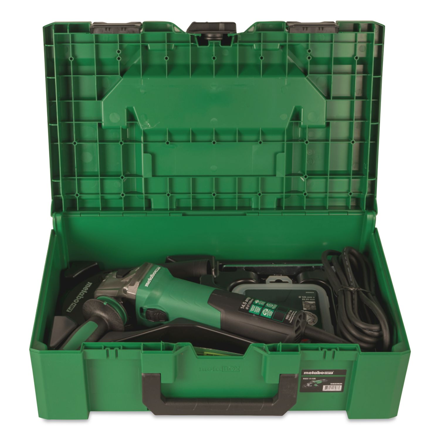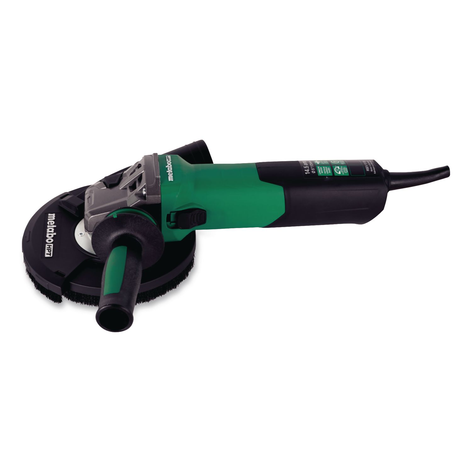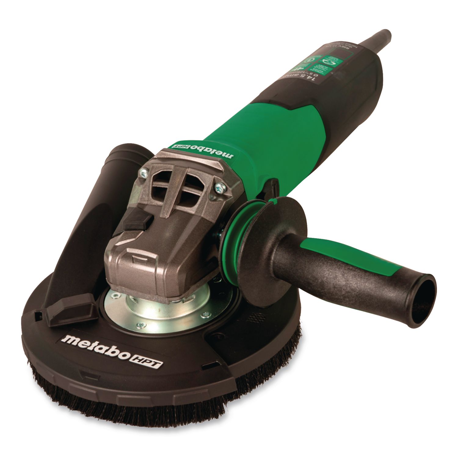 The Metabo HPT 5″ Pro Series variable-speed concrete grinder RSEV 17-125 Set is a professional-grade tool made for exceptional durability, safety and productivity in heavy-duty, dustless concrete grinding and restoration applications. Powered by a 14.5 A long-life motor, the tool delivers variable speeds from 2,800 to 9,600 RPM. It is ideal for edging, floor preparation, coating removal, leveling, and parting-line cleanup. Key electronic features include soft start, Vario-Tacho-Constamatic (VTC) speed stabilization, electronic overload protection and restart protection. For enhanced cooling and extended tool life, the motor features an unobstructed rear air intake, optimized airflow, epoxy-coated windings and a winding protection grid, extending armature life up to five times longer than grinders without it. Safety is enhanced with Metabo HPT’s patented S-Automatic mechanical safety clutch, which helps reduce kickback risk. The ergonomic design includes a lock-on slide switch and Metabo HPT’s MVT anti-vibration side handle, which reduces vibration by up to 60% compared to standard handles, ideal for prolonged use. The set includes a 5″ diamond cup wheel, a convertible dustless guard and a convenient Metabo HPT metaBOX 185 XL for transport and storage. Grinder Type: Angle; Wheel Diameter: 5″; Speed: 9,600 RPM; Tool Application: Coatings; Concrete; Screed.