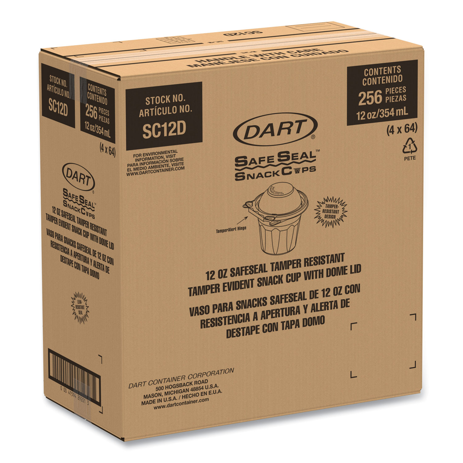TamperAlert hinge protrudes outward when torn, alerting the customer that the container has been opened. Hinge remains attached to the container, meaning no loose plastic pieces and therefore no littering. MicroTrim edge contributes to tamper-resistance by inhibiting the ability to lift up the lid from the base without tearing the hinge. 360 degree leak-resistant perimeter seal completely seals entire tray for maximum freshness and to prevent leaks. Recessed stacking platform provides greater stability of merchandising displays. Offset opening tabs and lift and hold embossing makes SafeSeal bowls easier to open. Crystal clear container with minimal sidewall ribbing. Dome Lid. Food Container Type: Base/Lid Combo; Material(s): PET Polyethylene Terephthalate; Material Type: Plastic; Interior Volume Capacity: 12 oz.