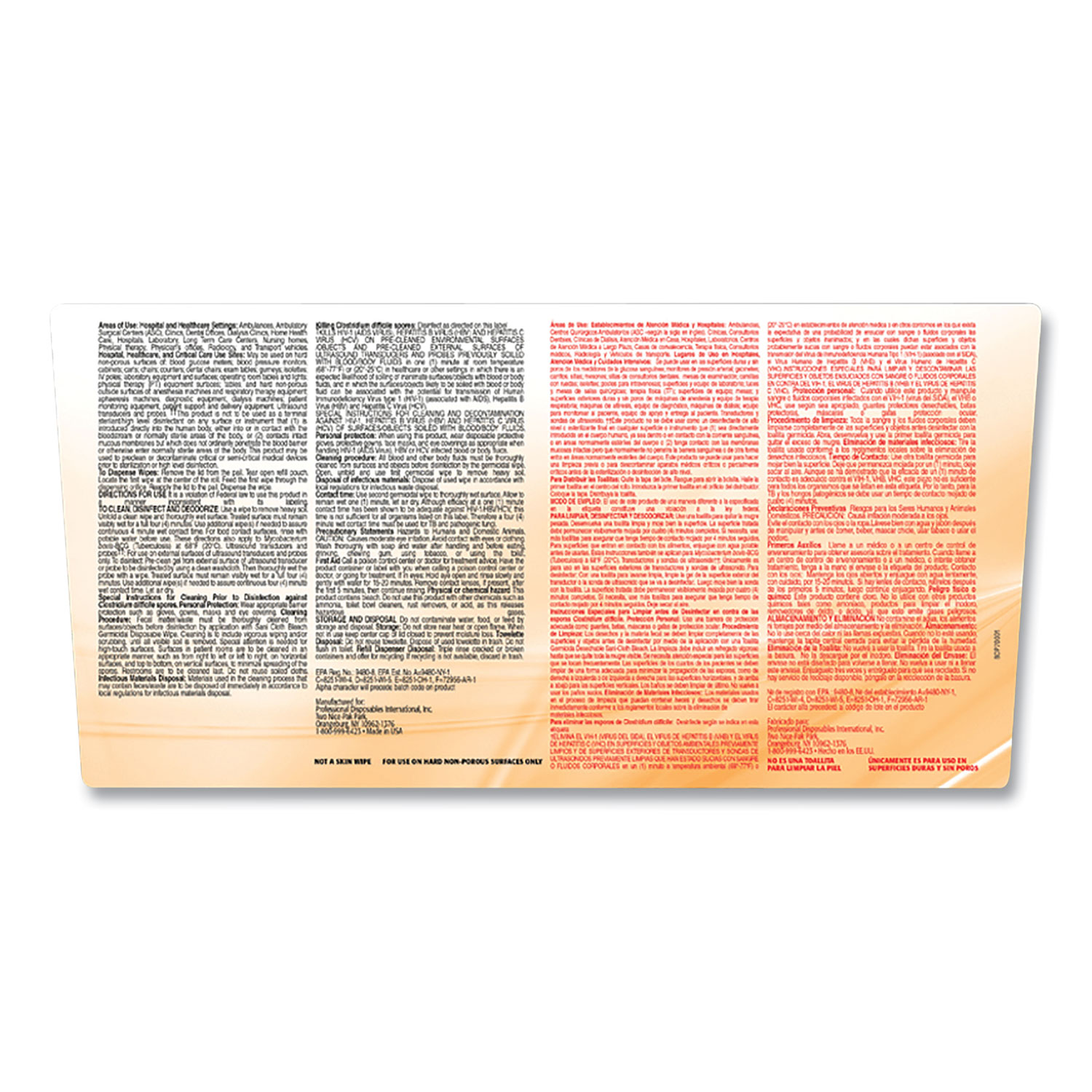 Pre-moistened, ready-to-use wipes are ideal for cleaning and disinfecting high-risk areas in one easy step. Bleach-based germicide eliminates 50 varieties of viruses, bacteria and fungi in four minutes or less, including multi-drug resistant bacteria, Clostridium difficile spores, Norovirus and tuberculosis. Clear- and clean-drying formula works wonderfully in all environments, from examination and patient rooms to kitchens and bathrooms. Prominent contact time labeling on all packaging types enables easy identification for improved compliance with accreditation standards. Towel/Wipe Type: Cleaning/Disinfecting Wipes; Applicable Material: Hard Nonporous Surfaces; Medical Equipment; Chemical Compound: Sodium Hypochlorite; Number of Plies: 1.