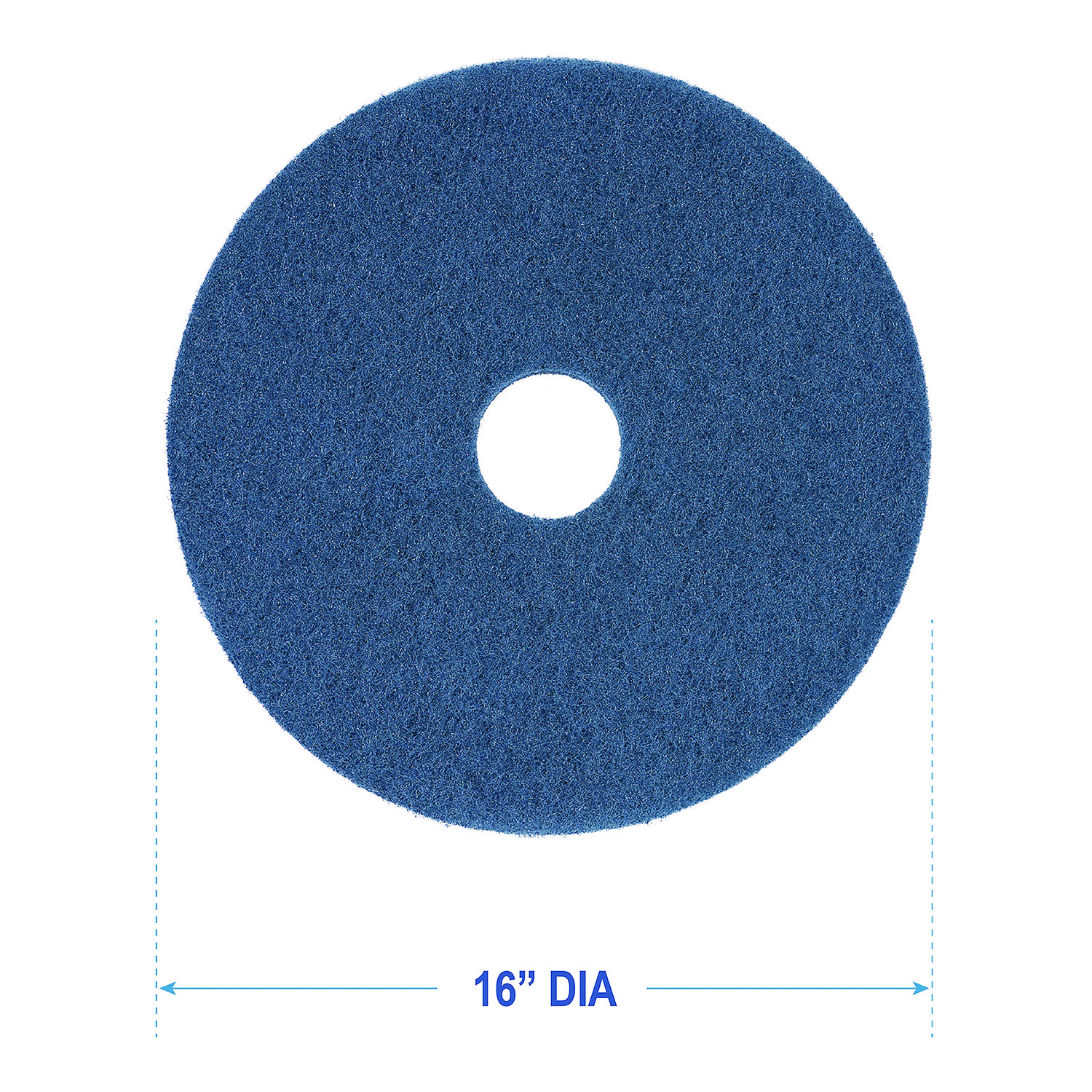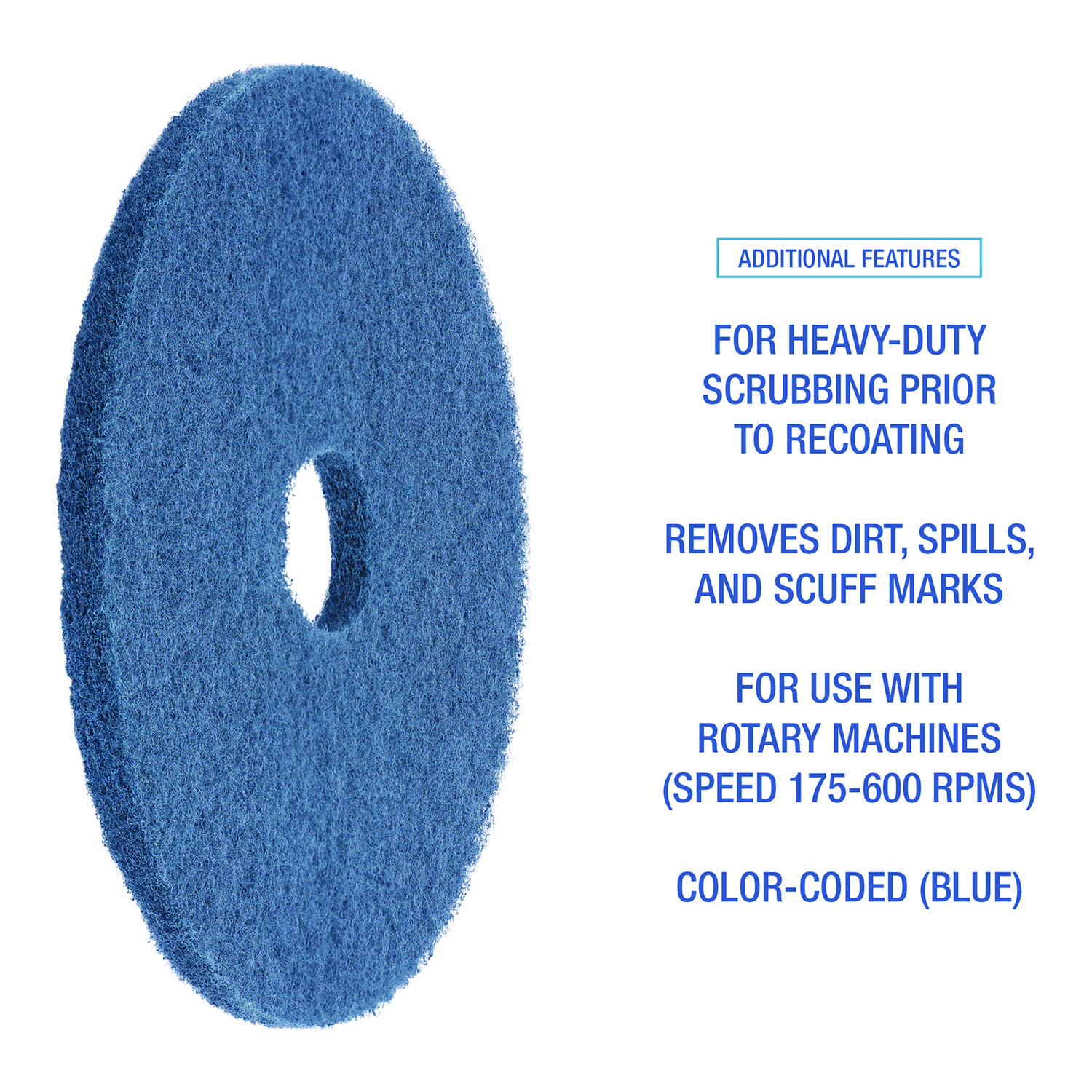 Heavy-duty scrubbing pad attaches to a rotary machine to remove dirt, spills, and scuffs. Easily scrub floors by mounting the pad onto the machine and let the powerful scrubbing pad go to work, removing heavy traffic and build-up with ease. The surface is cleaned, removed of debris, and ready for recoating if needed. For use with Rotary Machine Speed of 175 to 600 RPM. Color-coded for easy job identification. Floor Pads Application: Scrubbing; Diameter: 16″; Color(s): Blue; Color Family: Blue.