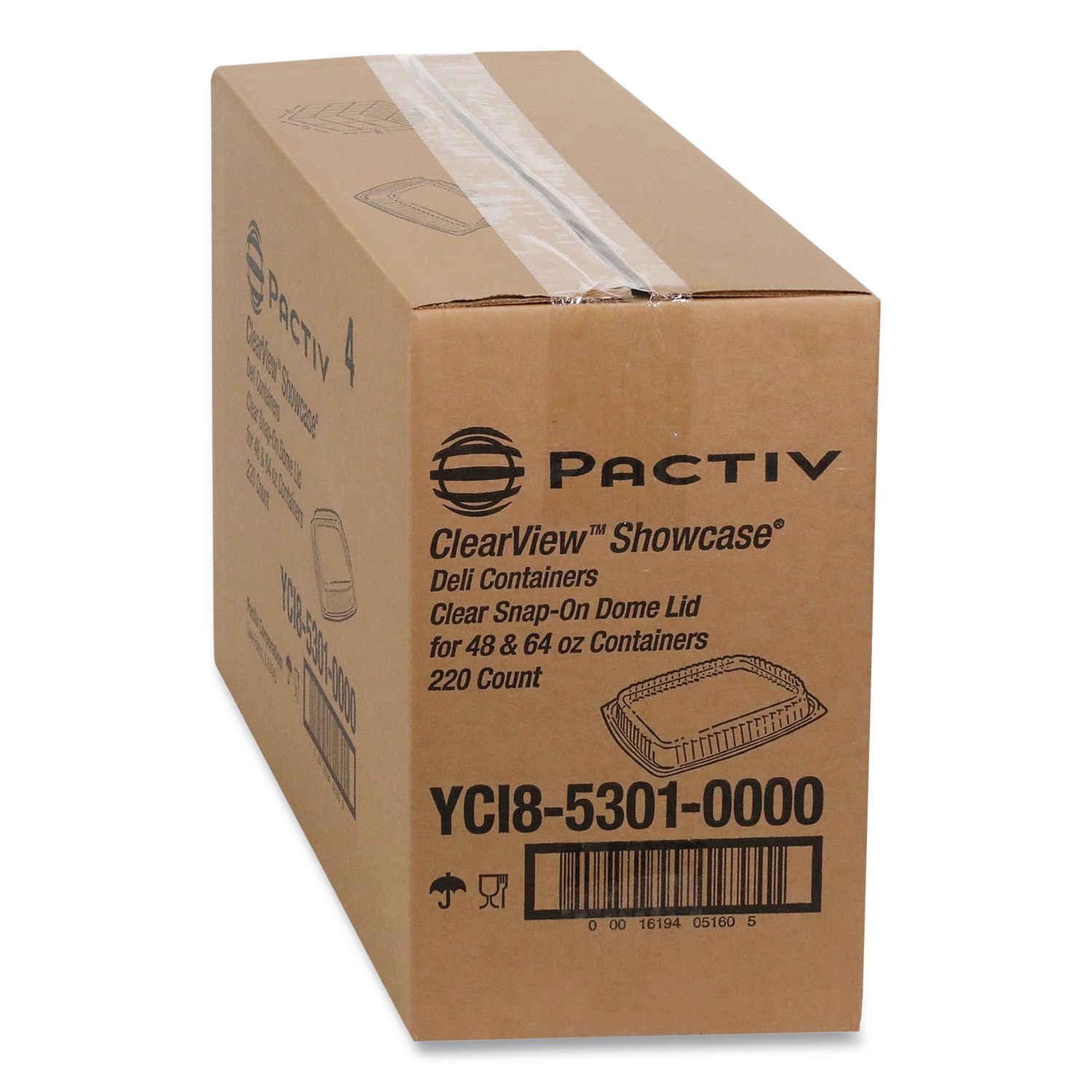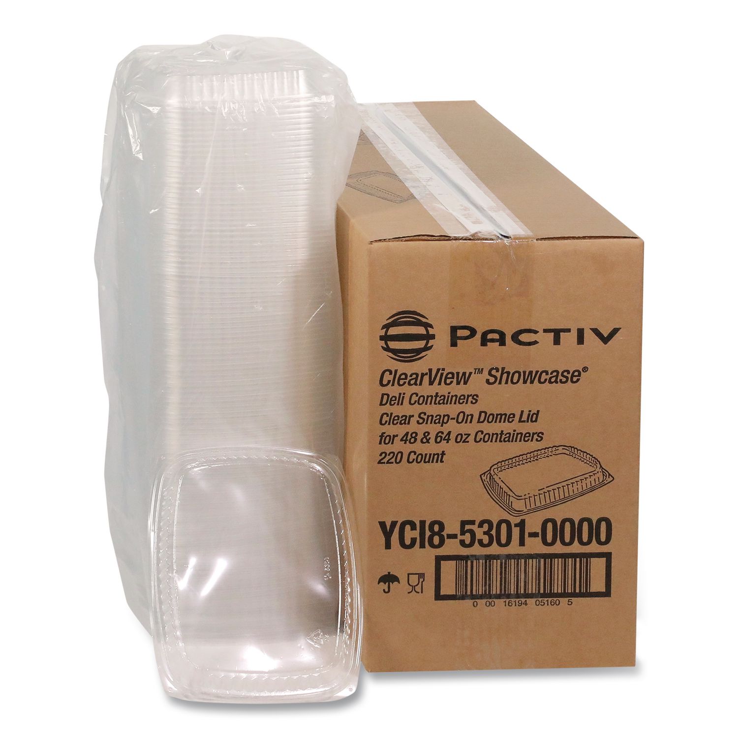 Pactiv’s Showcase® Deli Packaging provides excellent clarity to showcase various food applications. Secure lid fit to ensure freshness and provide leak resistance (base sold separately). Rim lock closure provides an audible “click” for easy, one-touch closure and a secure, locking fit. Highly durable construction for secure and reliable stacking. Dome Lid for 3-Compartment 48 and 64 oz Containers. Food Container Type: Lid; Material(s): Polystyrene; Material Type: Plastic; Color(s): Clear.