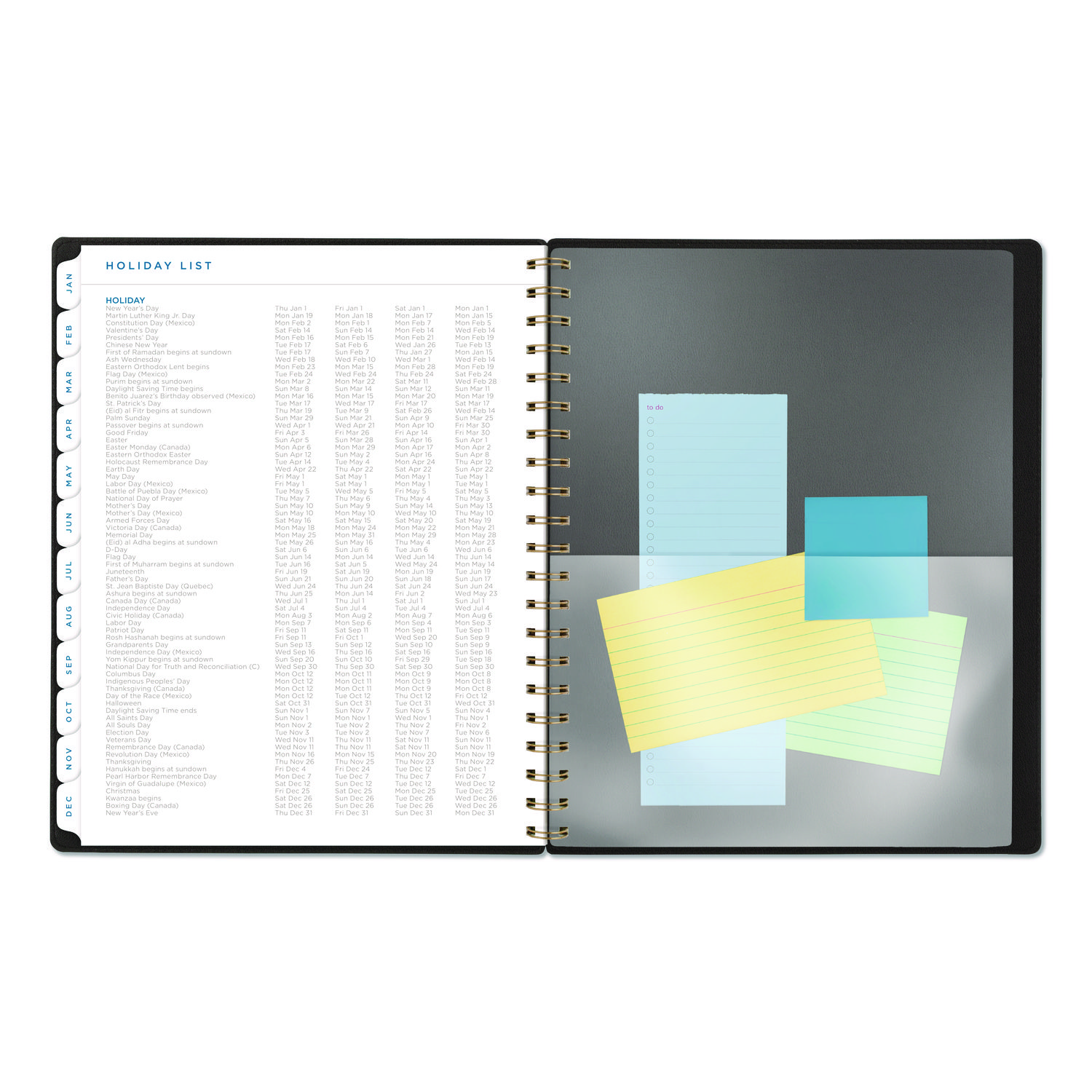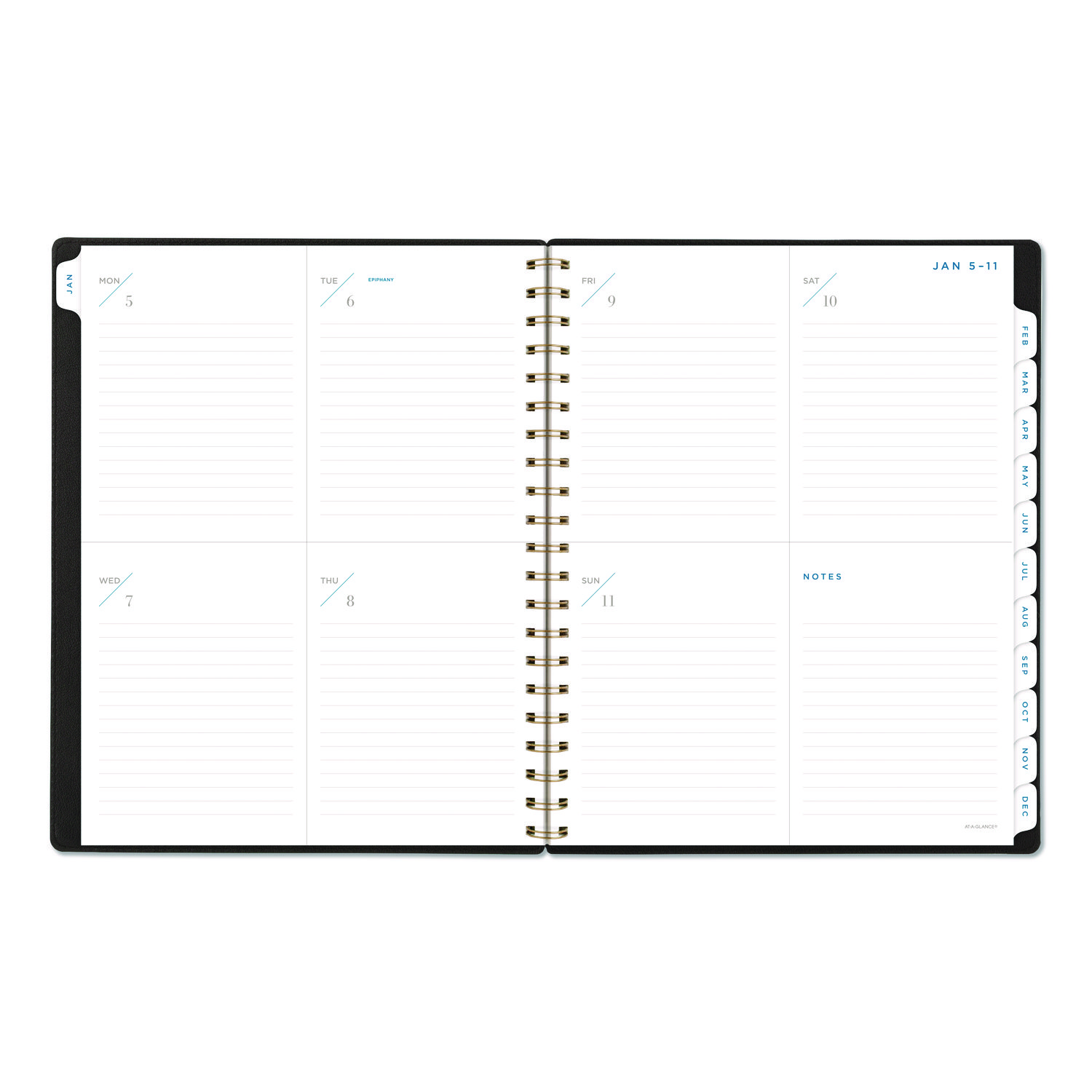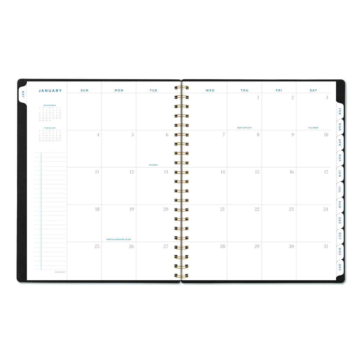 The AT-A-GLANCE Signature Lite Weekly Monthly Planner gives you everything you need to stay on track this year in one sleek, modern package. Give your planning some professional style with the modern and simplified cover with foil accents and a die-cut year detail. Plan your schedule without fear of distracting ink bleeding. Our high-quality paper has ink bleed resistance to keep your planning pages neat?. Weekly planning pages show day-to-day events and notes in an instant. Tabbed monthly overviews help you keep an eye on the big picture and get a jump on future plans. Get more done this year with help from special pages including holiday list, a three-year reference calendar and others.? The flexible yet durable cover keeps it shape, while the twin wire binding helps prevent snags when you throw it in your bag.?. Dated: Yes; Academic Year: No; Calendar Format: Weekly/Monthly; Calendar Spread Format: One Week per Two-Page Spread; One Month per Two-Page Spread.