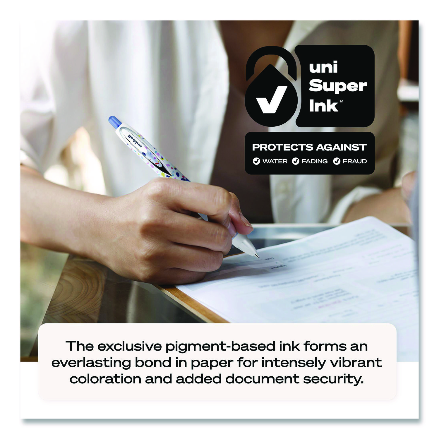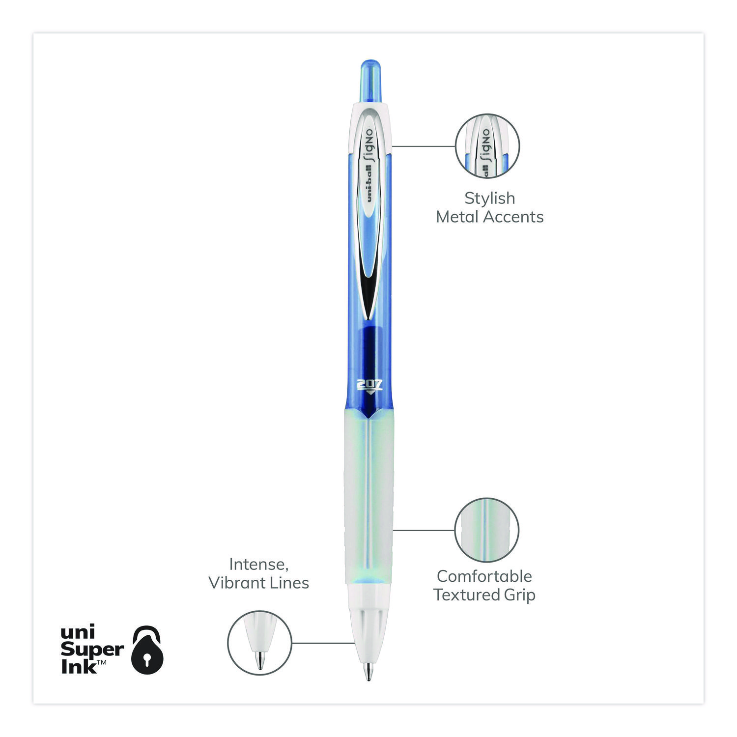 Stock your office, home or classroom with 207 Retractable Gel Pens from uni-ball with a stainless steel tip that resists bending and breaking. Even-flowing, pigment-based gel ink delivers a smooth writing experience for intense, vibrant lines, ensuring that every mark is brilliantly communicated. Use these retractable gel pens for everyday writing tasks, check signing and all of your important signatures, trusting its quick-drying uni Super Ink. Innovative uni Super Ink technology effectively entraps the gel ink into the paper, producing fraud, fade and water-resistant documents that resist check washing or bleaching. A textured grip offers greater comfort and control as you continue writing, while a translucent ink window indicates the level of gel ink remaining, so you don’t run out unexpectedly. The sleek design of the 207 with modern metal accents gives the retractable gel pen a stylish touch. Pen Sub-Brand & Product Family: Signo 207; Pen Type: Gel Pen; Pen Style: Retractable; Pen Tip Type: Conical.