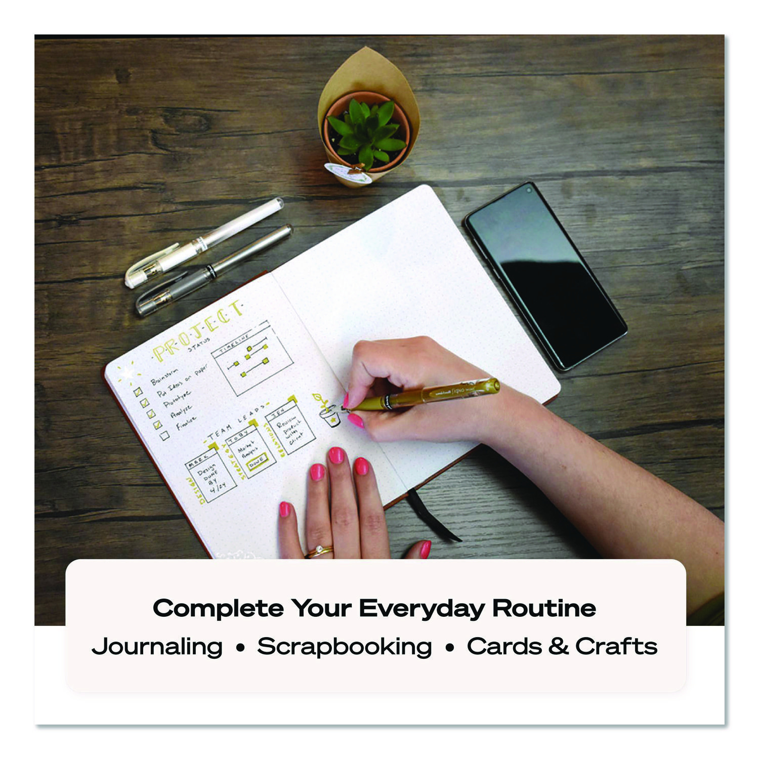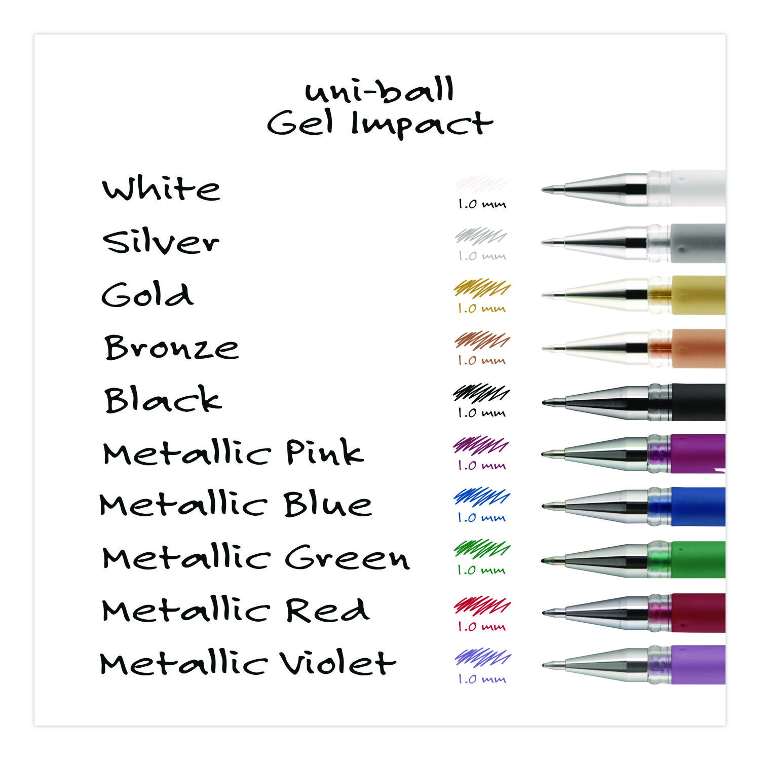 Inspire artistic interest as you easily embellish your writing and drawing. The shimmery shades of Signo Gel Impact Metallic Color Pens help your work stand out. Featuring a bold, thick and silky ink flow, Signo Gel Impact have a vibrancy that places them among the best pens for adding a pop of metallic flair. Their smooth-glide point and comfortable grip help you maintain precise control as you create, while making it easier to work longer whenever inspiration strikes. A quick-drying, acid-free ink formula and uni Super Ink technology ensure your marks are deeply entrenched into the paper for water- and fade-resistant, archival-safe results, making these pens ideal for decorating scrapbooks, journals, greeting cards.. anything you want to last. If you’re feeling adventurous, try them out for adding an artful twist to letters and envelopes or for elevating your important notes and bullet points to the next level. No matter how you choose to use them, Signo Gel Impact Metallic Color Pens deliver the right balance of vibrancy, performance and precision to meet your needs in any creative endeavor. Pen Sub-Brand & Product Family: Signo Impact; Pen Type: Gel Pen; Pen Style: Stick; Pen Tip Type: Conical.