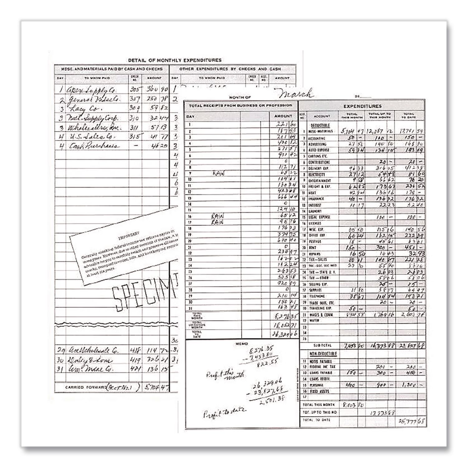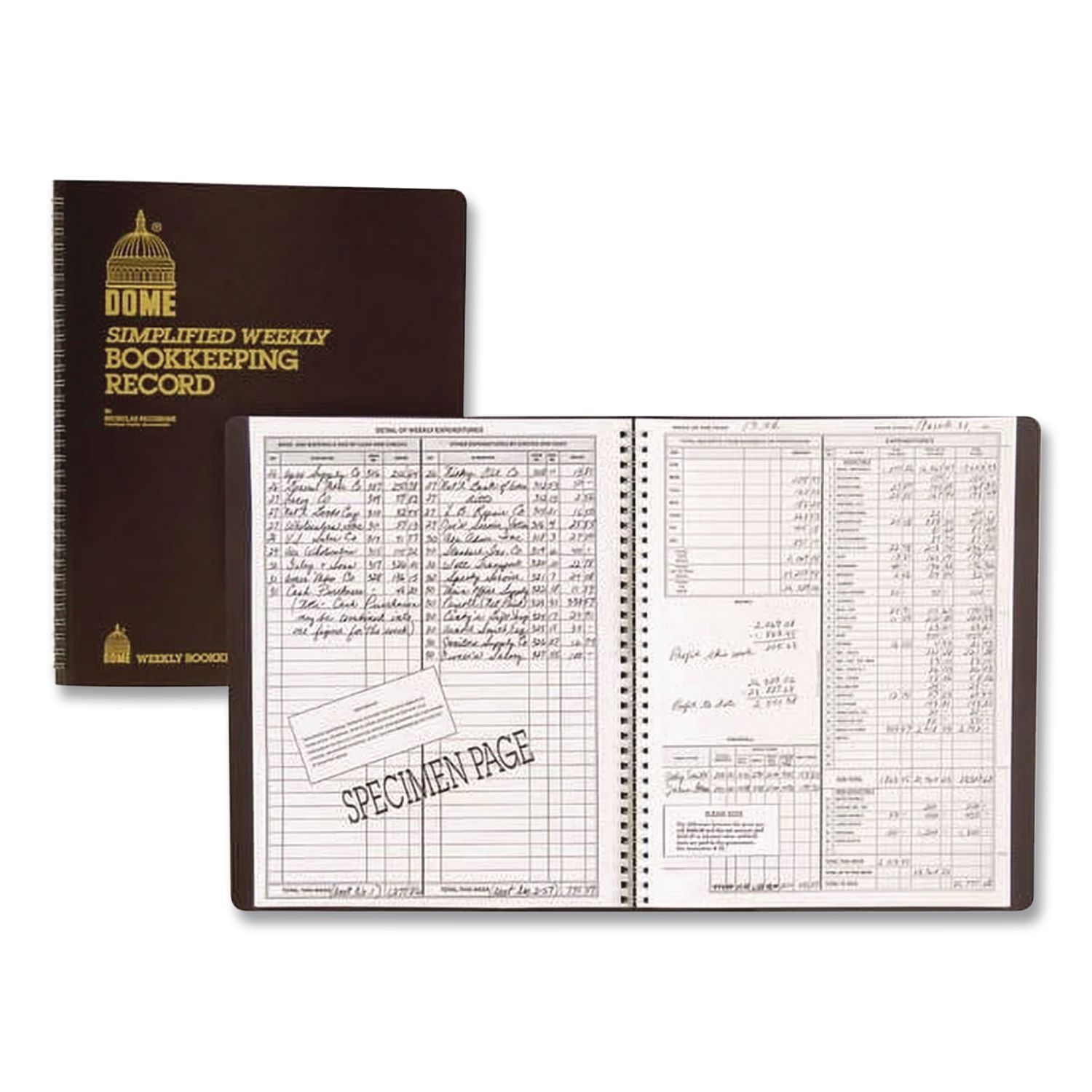 The perfect cash record keeping system for small and home-based businesses. Features a calendar of important dates, filled in specimen page and record of cash received and paid out, net profit and net worth. Includes payroll section for up to six employees. 4″ columns. Wirebound vinyl cover. Undated. Unnumbered pages. Simplified Weekly 4-Column Format. Book-Binding Type: Wire-O; Book-Binding Details: Twin-Wire: Flexible Cover; Book-Cover Color: Brown; Color Family: Brown.