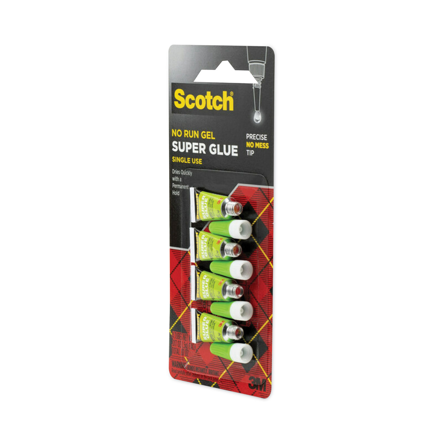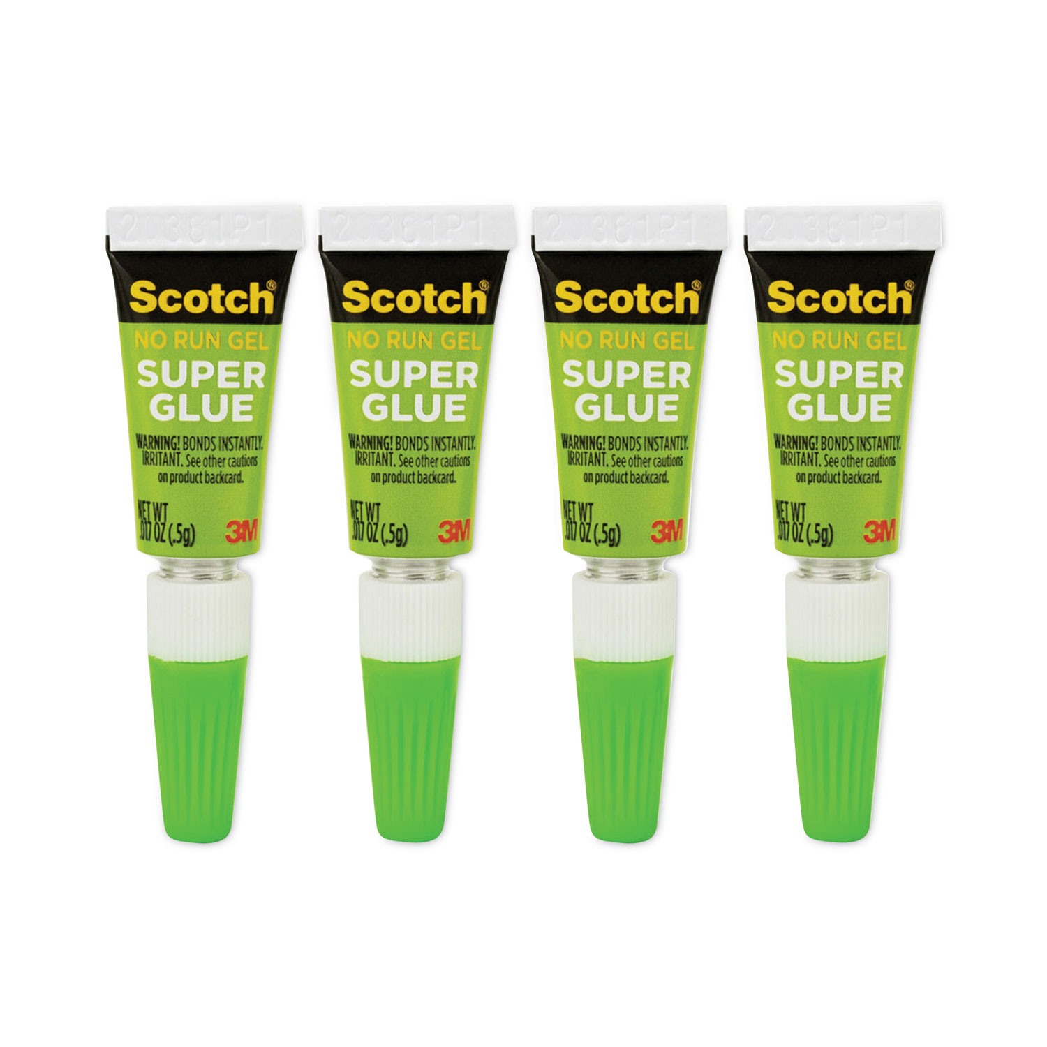 Scotch® Single Use Super Glue Gel is a fast-drying, strong adhesive designed for a wide variety of porous and non-porous surfaces. Excellent for wood, metal, rubber, vinyl, leather, ceramics, some plastics, and other surfaces. Gel formula makes it easier to control and does not run. Each tube contains enough adhesive for a single application. No-Run Gel—Great for repairs with gap fills. Adhesive Type: Gel; Product Packaging: Tube; Washable/Removable: No; Color on Application: Clear.