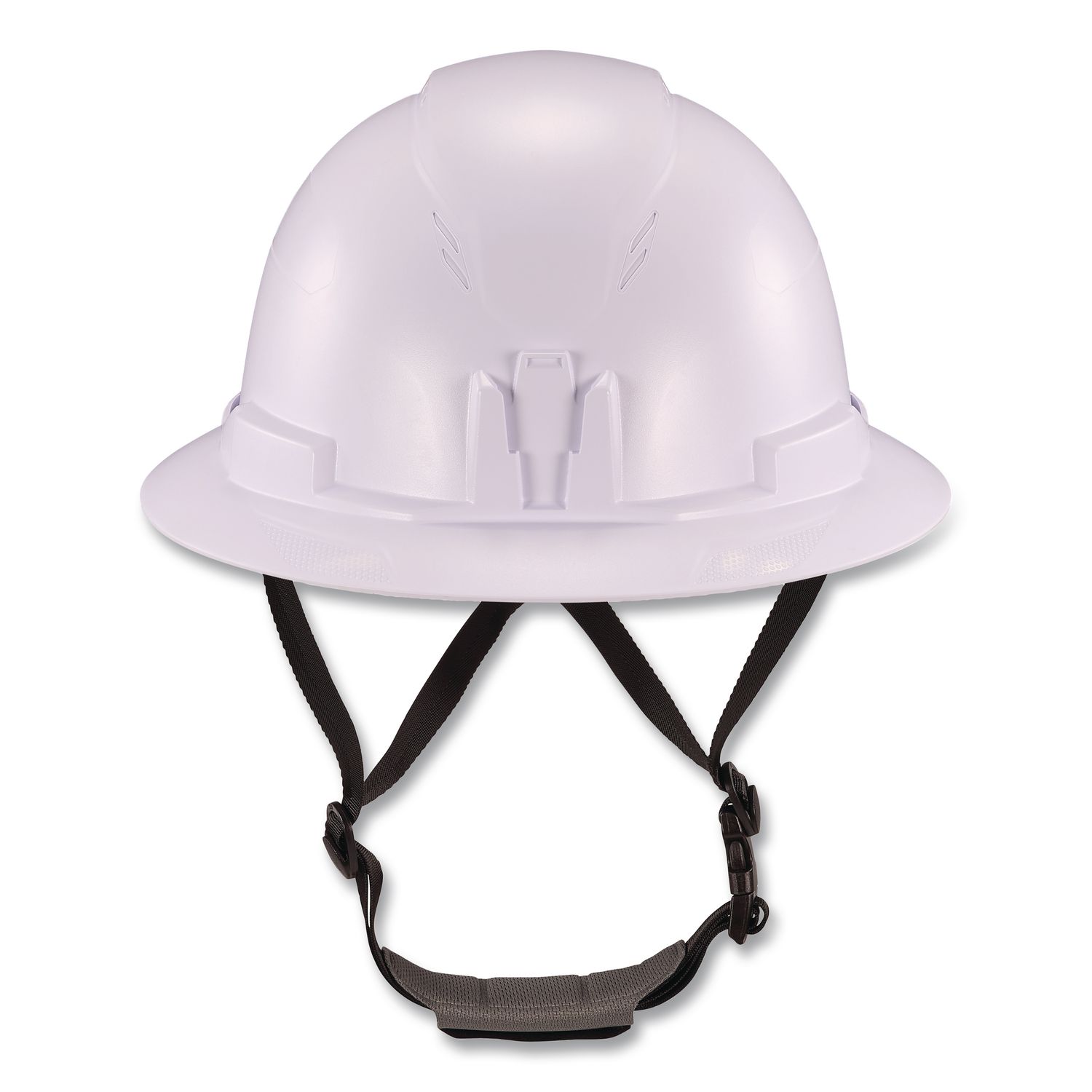The Skullerz 8963 Class E Full Brim Safety Helmet is a Type 2 Safety Helmet with a 6-point suspension and an EPS foam interior halo for all-around impact protection. This helmet provides heavy-duty, yet lightweight and comfortable head protection designed to shield the front, back, top and sides of the head from falls, dropped objects or bumping into stationary objects. Compared to 4-point suspension systems, the 6-point suspension better disperses the force of an impact. The compact helmet design improves visibility, and an adjustable chin strap ensures the helmet remains secure to the wearer’s head upon impact or sudden movement such as a slip, trip or fall. The safety helmet meets ANSI/ISEA Z89.1-2014 (R2019), Type 2, Class E requirements and has been tested in both high and low temperature. The suspension and shell design of this helmet provides added side, front and back protection compared to an ANSI/ISEA Z89.1-2014 (R2019) Type 1 requirements. A padded, breathable and antimicrobial brushed polyester sweatband and top pad lines the sides, forehead and top interior, and is removable for easy replacement. The ventilated, open frame design makes for a cooler safety helmet by releasing heat buildup and allowing air to circulate-reducing perspiration in hot and humid working environments. One of the biggest challenges for workers is how to attach lights to a hard hat in a way that eliminates the need to adjust and fuss with accessories. This safety helmet includes front and rear slots for secure attachment of ergodyne® Skullerz Hard Hat Headlamps and Fans (sold separately). For jobs where increased eye and hearing protection is needed, side built-in slots accept earmuffs and face shields. Ideal for construction and utility job sites, oil and gas, road work, forestry, mining and general site work. Hard Hat Type: Type 2; Electrical Class: Class E; Suspension: 6-Point; Adjusting Method: Standard Ratchet.