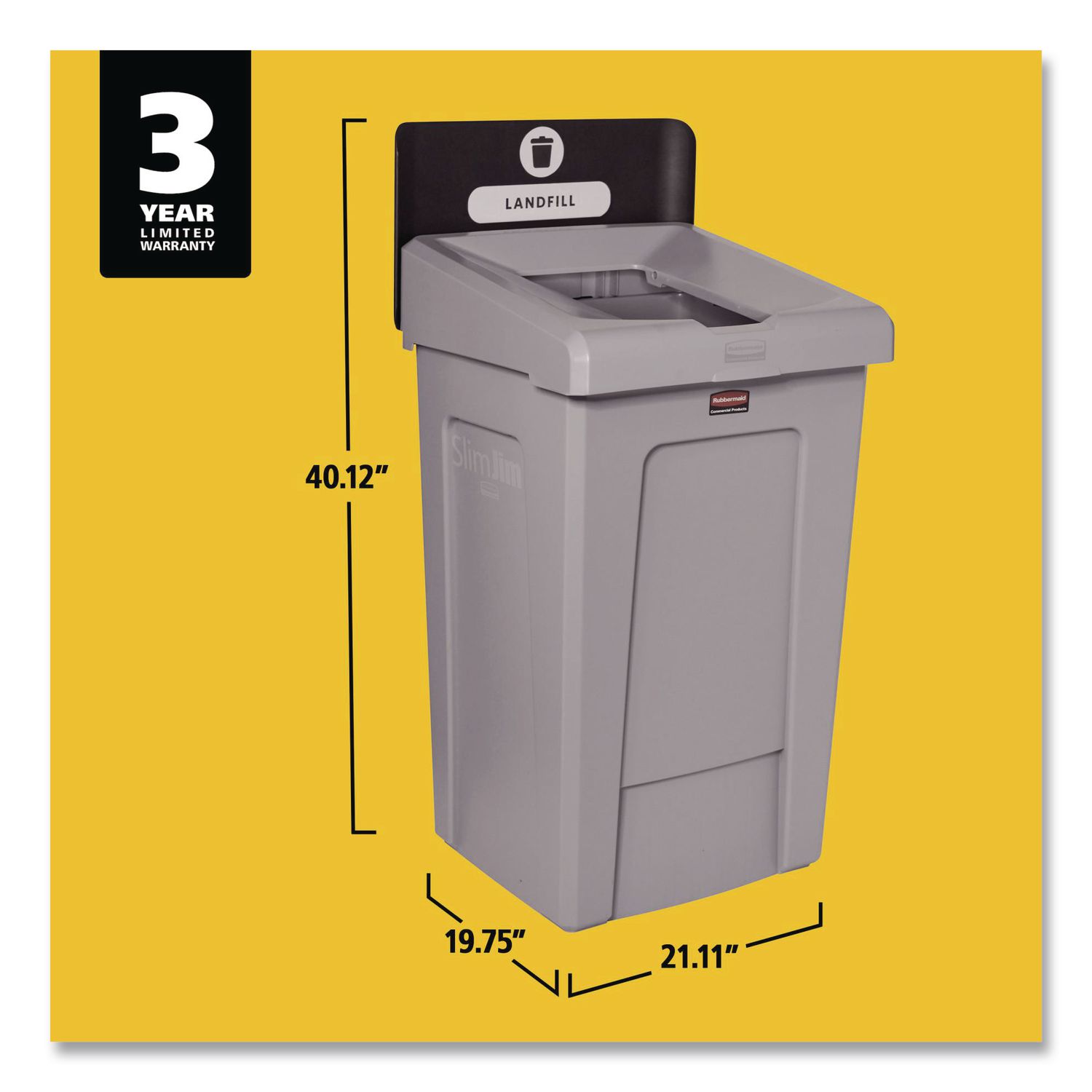 The Rubbermaid Commercial Slim Jim Recycling Station offers an adaptable recycling solution to fit any commercial facility’s recycling needs and it seamlessly connects with the 23G Slim Jim Recycling Station. The station features color-coded lids and billboards, stream-specific openings, and labeling with intuitive icons and verbiage to help patrons and staff sort recyclables with ease. The station connects without the use of hardware or tools for easy assembly; the durable connector snaps into place, securely holding the containers together. The container features bag cinches, eliminating the need to tie knots to secure liners. Additionally, its venting channels make it up to 75% easier to remove full liners. Landfill Recycling Station. Waste Receptacle Type: Indoor Recycling Bin; Material(s): Resin; Application: Indoor Recycling; Interior Volume Capacity: 33 gal.