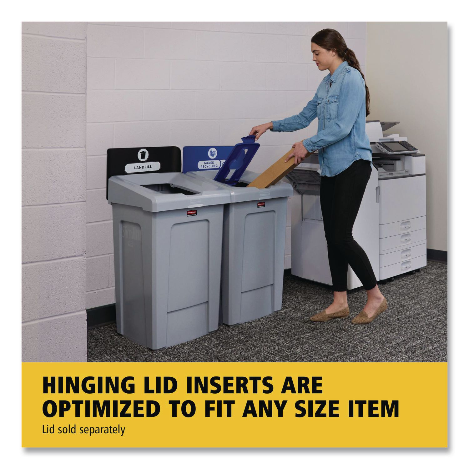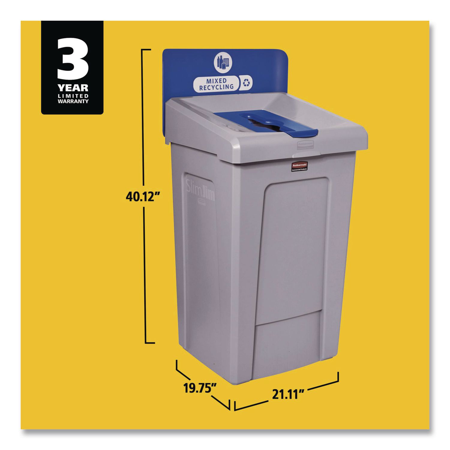The Rubbermaid Commercial Slim Jim Recycling Station offers an adaptable recycling solution to fit any commercial facility’s recycling needs and it seamlessly connects with the 23G Slim Jim Recycling Station. The station features color-coded lids and billboards, stream-specific openings, and labeling with intuitive icons and verbiage to help patrons and staff sort recyclables with ease. The station connects without the use of hardware or tools for easy assembly; the durable connector snaps into place, securely holding the containers together. The container features bag cinches, eliminating the need to tie knots to secure liners. Additionally, its venting channels make it up to 75% easier to remove full liners. Mixed Recycling Station. Waste Receptacle Type: Indoor Recycling Bin; Material(s): Resin; Application: Indoor Recycling; Interior Volume Capacity: 33 gal.