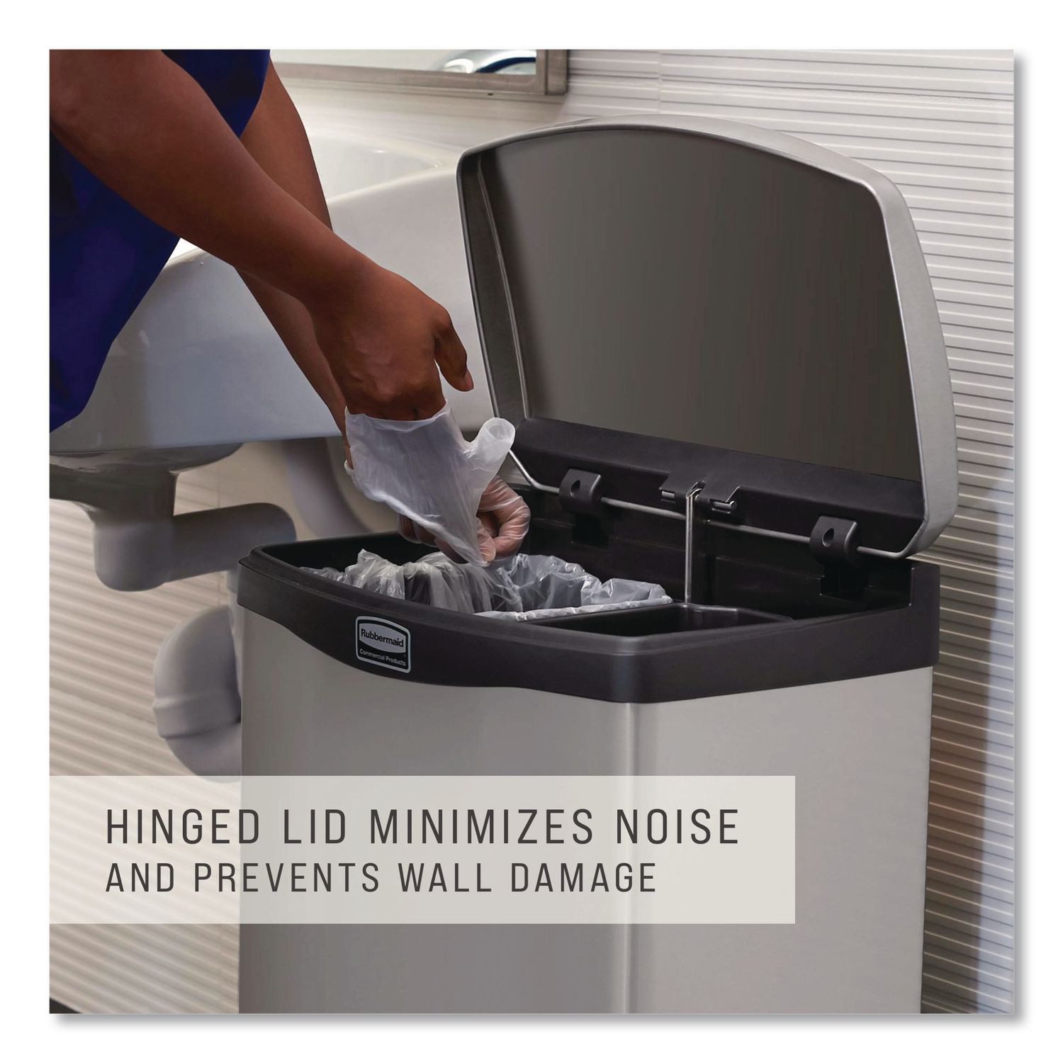 Designed to satisfy the diverse needs of any facility. Maximizes space efficiency with a small footprint and slim profile. Fits in even the tightest spaces. Fingerprint resistant stainless steel is easy to maintain for enhanced aesthetics. Internal hinge design prevents wall damage. Quiet and controlled lid-closure minimizes noise. Liner retainer band and cinch easily and securely holds can liners. Increased foot pedal clearance for easier access and operation. Front Step Style-Foot pedal located on the wide side of the container. Waste Receptacle Type: Indoor All-Purpose Waste Bin; Material(s): Stainless Steel; Application: Indoor All-Purpose Waste Disposal; Interior Volume Capacity: 13 gal.