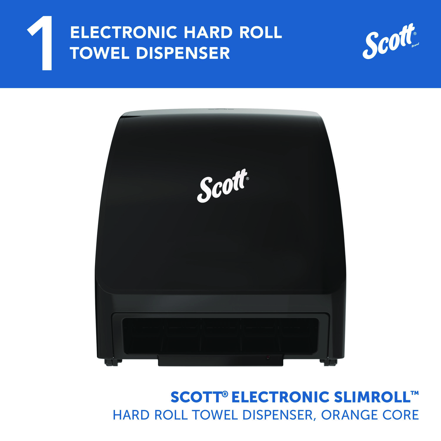 With the Scott Electronic Slimroll Dispensing System you have the benefit of a compact electronic dispenser designed to fit in tight spaces with a slim profile. The sleek design and touchless dispensing system helps to minimize the spread of dirt and germs all while providing 25% more hand dries over folded towels. The ultra-compact Scott Slimroll* allows you to mount the dispenser close to sinks and in tight places and keeping it close to the water helps reduce drips and slips. Simply place a hand under the dispenser to receive a nominal 10 inches of towel, a second sheet will dispense at 10% reduced length when activated within a few seconds of the first dispense. The dispenser is made of high impact plastic. Towels Dispensers Type: Roll Towel Dispenser; Dispenser Capacity (text): One Roll; Material(s): Plastic; Color(s): Black.