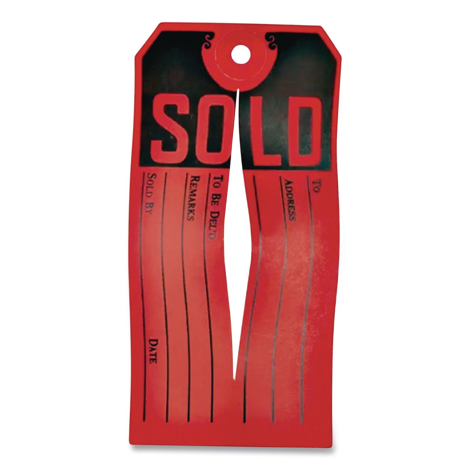 Update the status of your items for sale quickly with these easy-to-use Sold Tags. Each tag is printed with black ink on eye-catching red cardstock so shoppers will immediately recognize which items are off the market. Preprinted lines let you fill out buyer, seller and delivery information for easy reference. Enjoy the ease of the knife-slit design, or thread a fastener through the tag’s reinforced hole. You’ll be sold on the convenience. Size: 4.75 x 2.38; Color(s): Red/Black; Depicted Text: “SOLD” with Identifying Information; Material(s): Paper Stock.