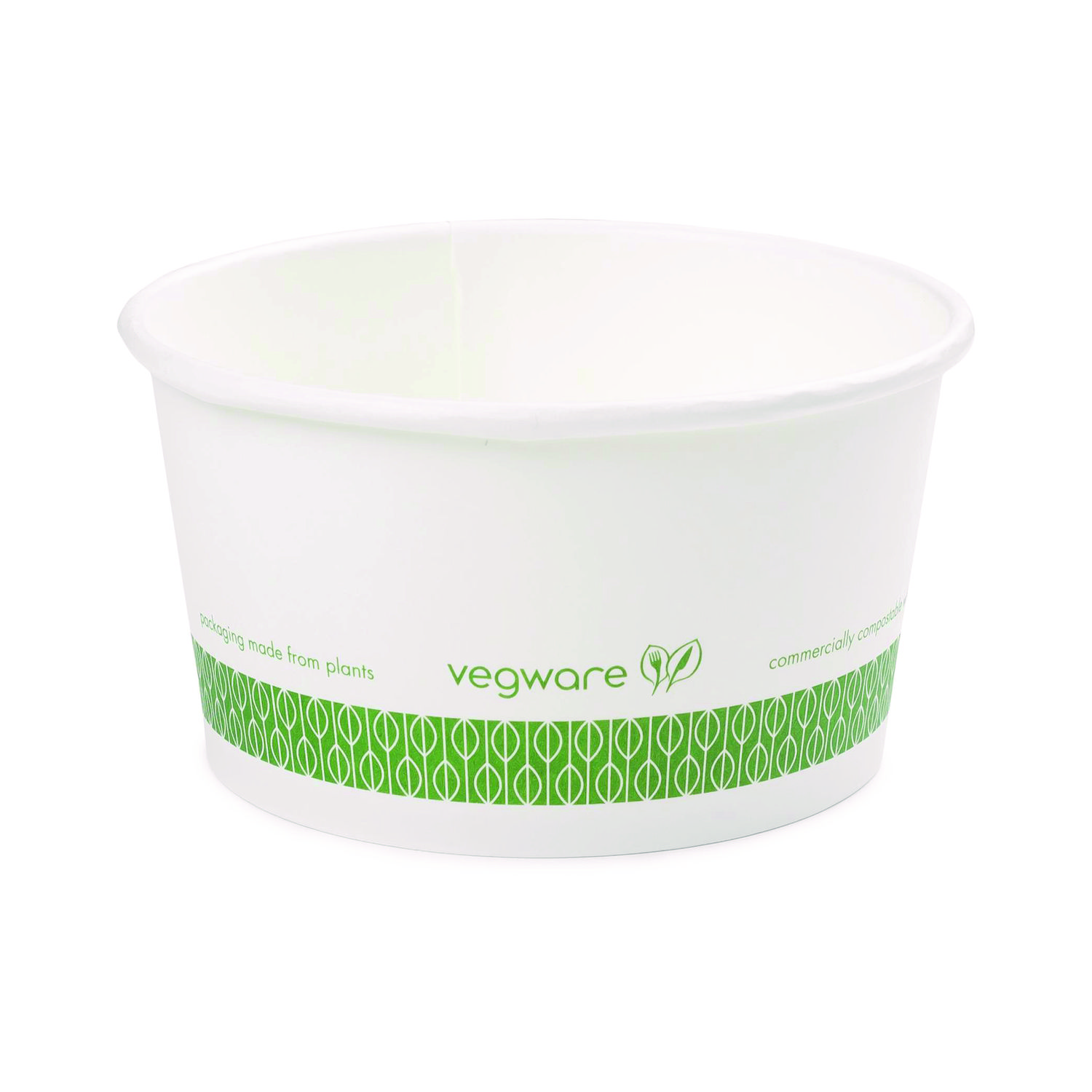 These soup cups are versatile, leakproof, and sturdy round tubs. They are ideal for both hot and cold foods. Sustainable board with a plant-based PLA lining. Crisp white, with Vegware messaging in green. Award-winning quality by Vegware, made from plants. Commercially compostable where accepted. Vegware is a trusted brand of plant-based compostable food packaging and its end-of-life solutions. Our products are made from plants using renewable, recycled or reclaimed materials. We hold the deepest set of composability certification in the sector. Our full product range can be commercially composted with food waste where accepted and meet rigorous compostability standards. Independent bodies have certified our products can break down in under 12 weeks in industrial composting facilities. 12 ozPerfect for hot soups, pasta, noodles, oatmeal, one-pot meals or for cold salads or ice cream. Food Container Type: Base; Material(s): PLA-Lined Board; Material Type: Paper; Interior Volume Capacity: 12 oz.