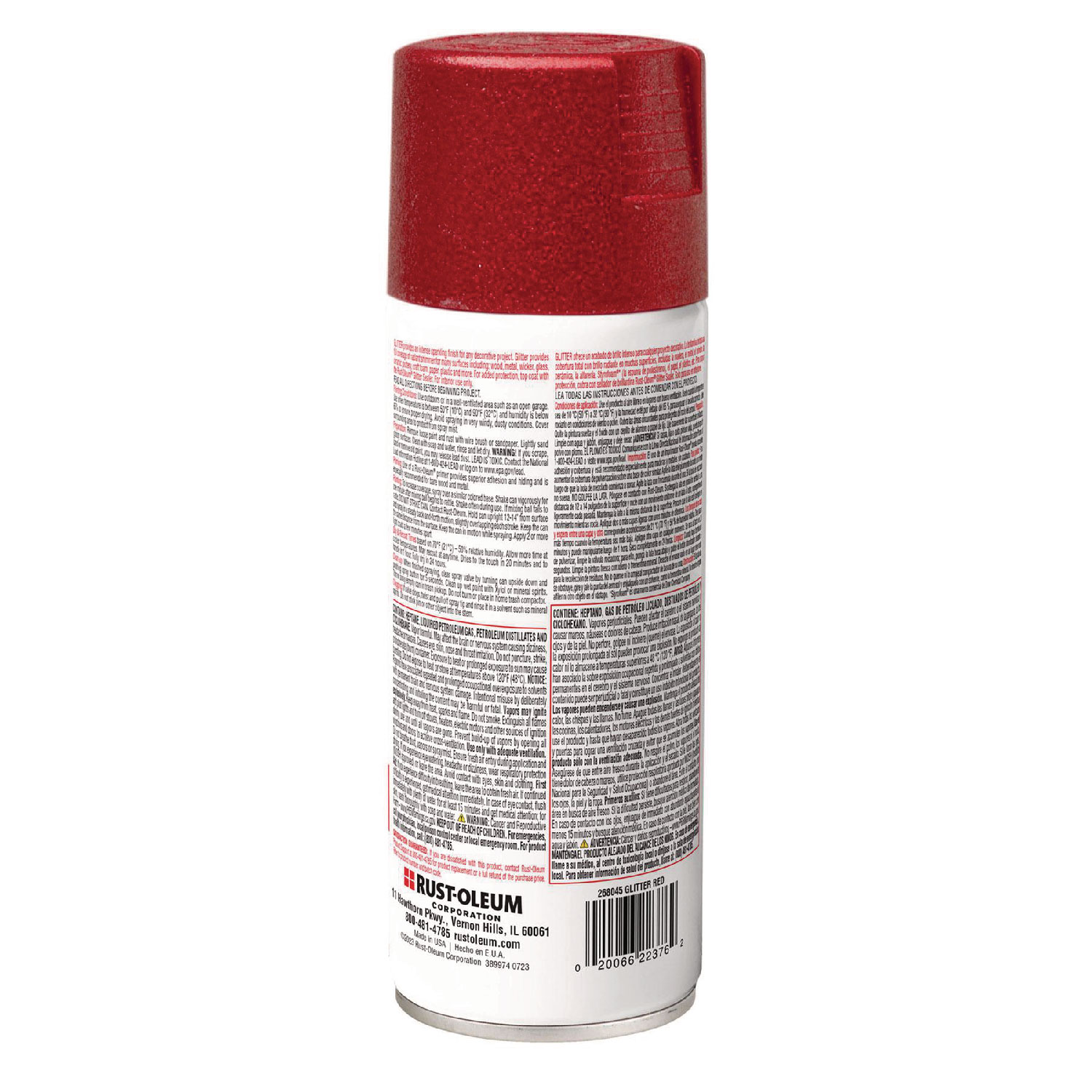 Rust-Oleum Specialty Glitter Spray provides an intense sparkling finish for any interior craft or decorative project. Unique glitter paint can be layered for a deeper effect and enhanced radiant shimmer. Glitter Spray Paint works on a variety of surfaces to add a pop of color for any special event or gathering. Apply over a similar color base coat for maximum sparkle and full coverage. Paint Sub-Category: Specialty; Spray Paint; Intended Application Environment: Interior; Finish/Sheen: Glitter; Color(s): Red.