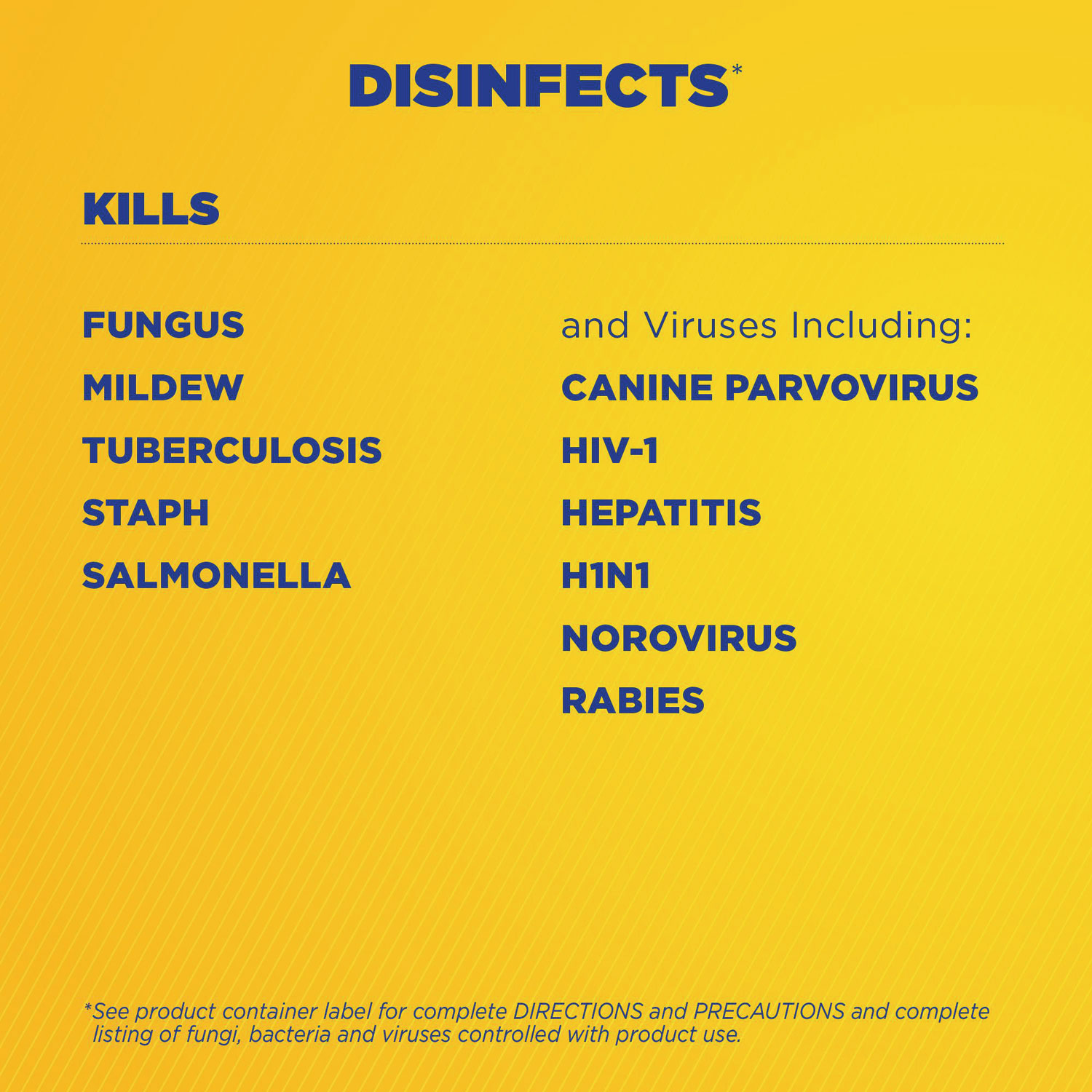 Powerful detergent system quickly cuts through grease and heavy soil to allow for easy wiping. Kills HIV-1 (associated with AIDS), HBV (Hepatitis B Virus), Influenza A (Pandemic 2009 H1N1), Norovirus (Norwalk), Canine Parvovirus, Rabies Virus, and more. Yuberculocidal, virucide, fungicide, and mildewstat. Kills canine parvovirus. Ready-to-use. Application: Disinfectant/Cleaner; Applicable Material: Food Contact Surfaces; Hard, Non-Porous Surfaces; Chemical Compound: 2-(2-Butoxyethoxy) Ethanol; Dirt Types: Grease; Heavy Soil; Pseudomonas Aeruginosa; Salmonella Enterica; Staphylococcus Aureus.