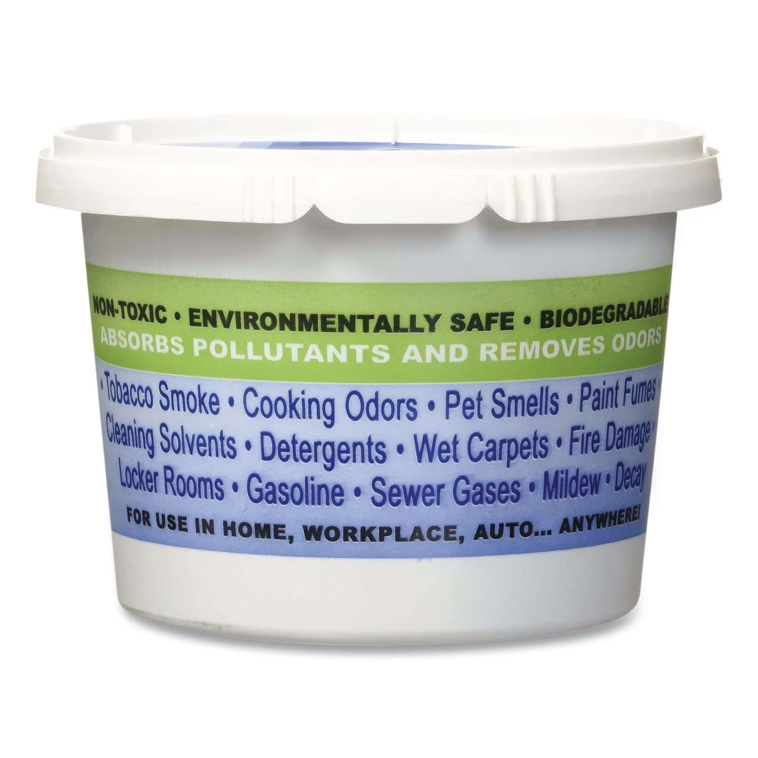 Nature’s Air Sponge contains a soap based gel with activated charcoal. When opened, the two components work together to dissipate a stream of “lighter than air” molecules into the environment, interacting with and neutralizing odor and pollutant molecules. This creates a pure, fresh, healthy air quality. Covers up to 300 square feet with an 8 foot standard ceiling. Last Up To Three Months. Physical Form: Gel; Application: Odor Control; Volume Capacity: 16 oz; Product Packaging: Cup.