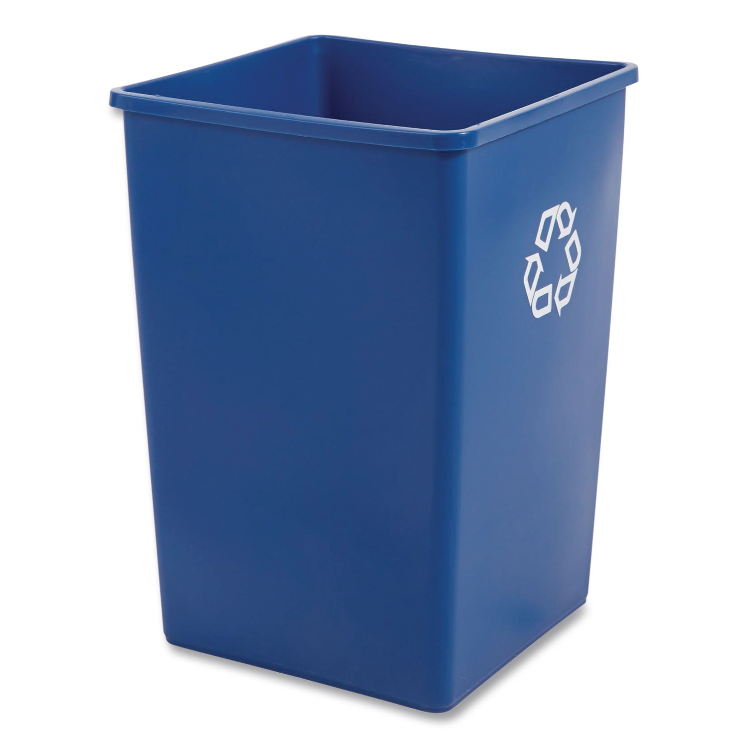Rubbermaid Commercial Square Recycle Bins are perfect for use in areas of high paper generation, such as near copiers, printers, and in mailrooms. This recycle bin contains Post-Consumer Recycled Resin (PCR), exceeding EPA guidelines. The recycling bin station containers serve as a convenient central collection site for multiple work stations. Recommended for indoor and outdoor use. The large capacity is ideal for heavy traffic areas. These recycle bins are designed to withstand extreme weather and handling. Waste Receptacle Type: Indoor Recycling Bin; Material(s): Plastic; Application: Indoor Recycling; Interior Volume Capacity: 35 gal.