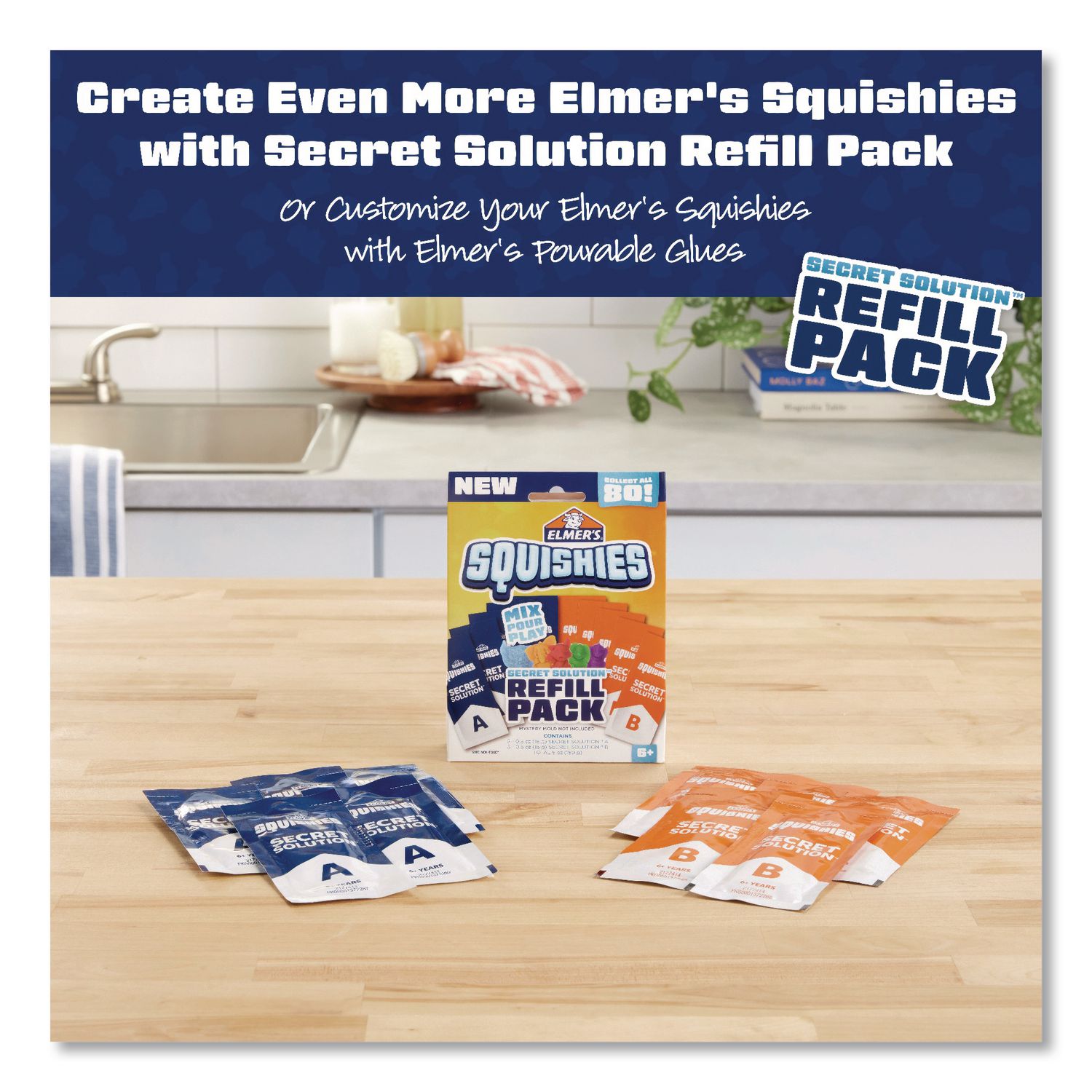 Package Includes: (2) Character Molds; (2) Secret Solutions (A & B); (2) Mixing Cups; (2) Stir Sticks; (2) Elmer's Glue Pens