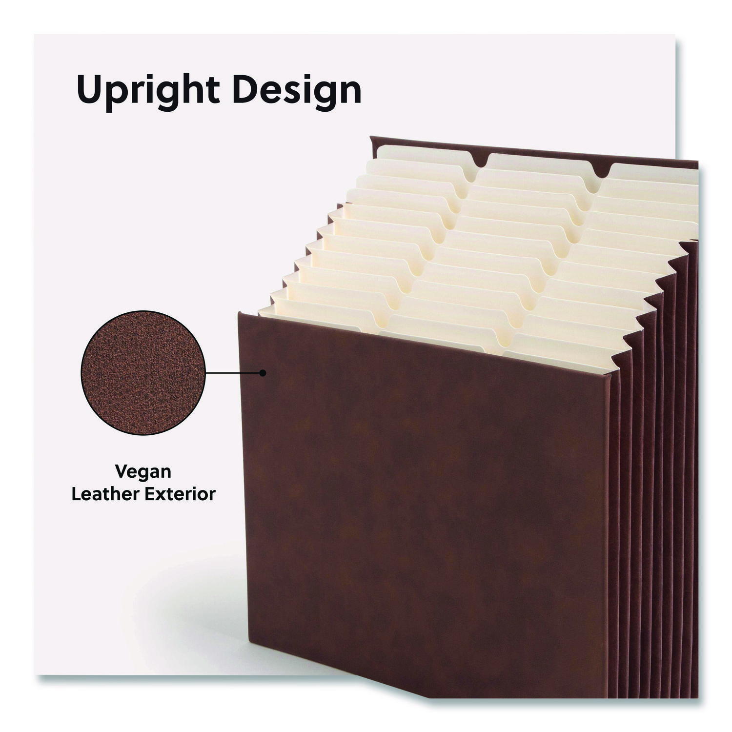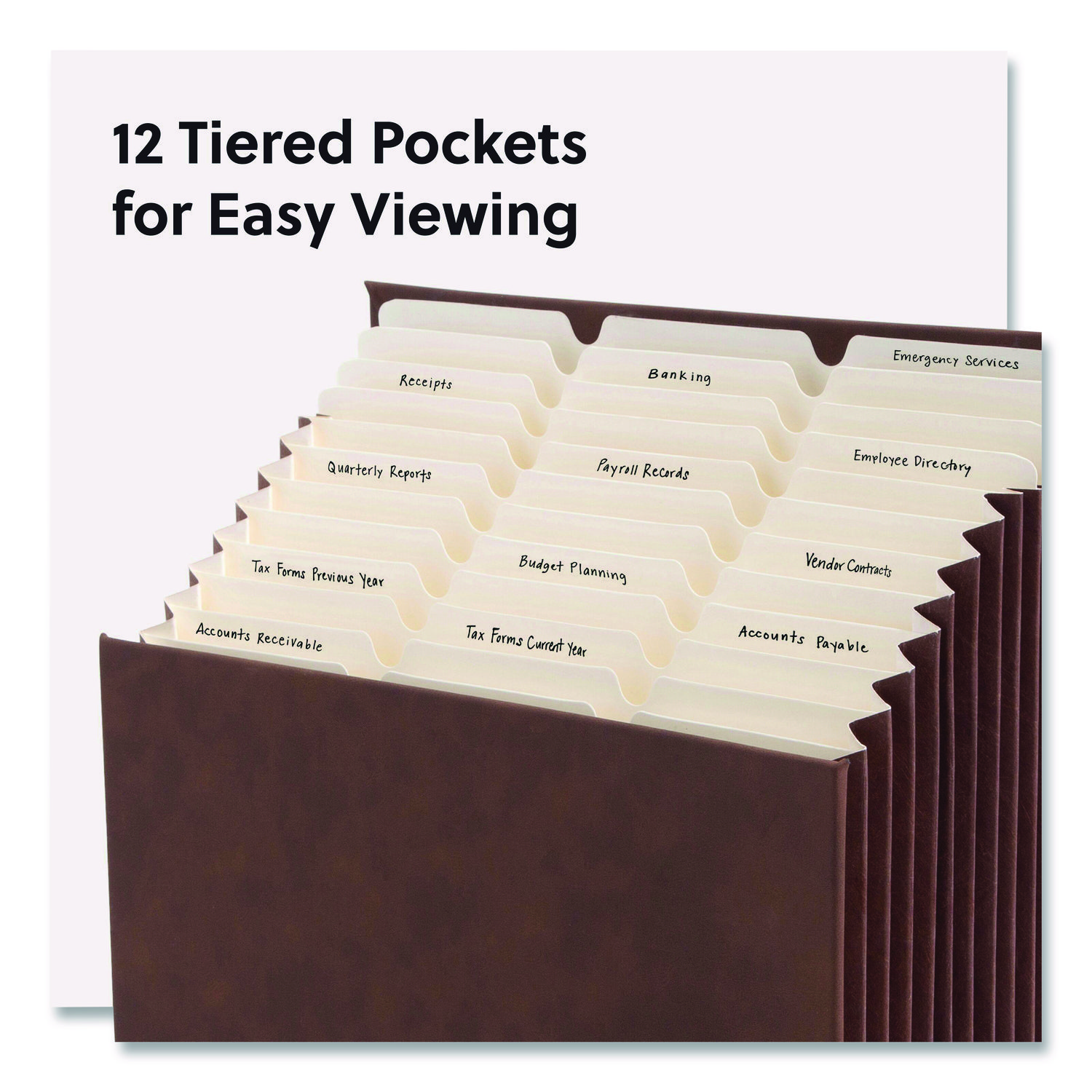 The 12-pocket StadiumĀ® file is ideal for clearing clutter from your workspace or countertop. You can turn piles into files with this tiered expanding file that lets you see everything at a glance. The pockets are tiered and fixed so the papers don’t fall to the bottom of the file. It is great for organizing both papers and folders. Fully lined tear-resistant gussets. Pocket/Wallet Type: Documents/Files; Document Size Range: Letter; Overall Expansion: 10.5″; Color(s): Saddle.
