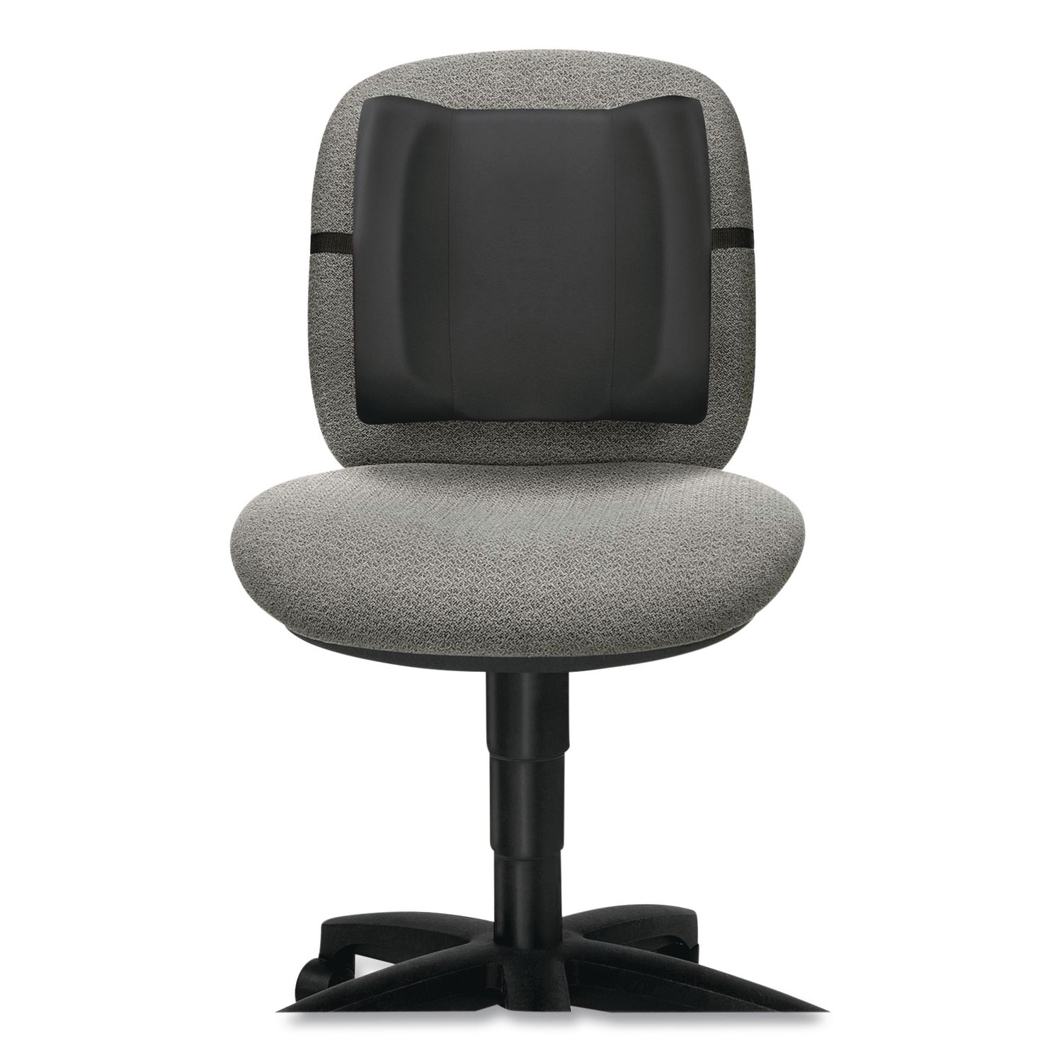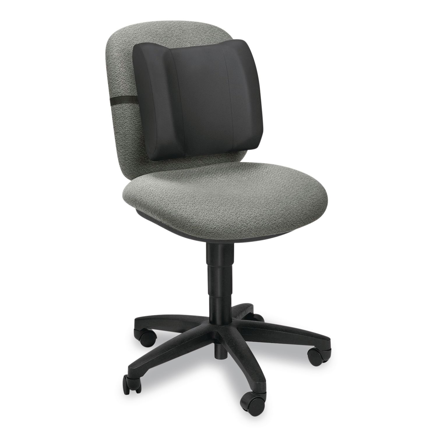 Attach this backrest cushion to an office chair to achieve comfort while sitting for extended periods. Supports the entire back. The cushion is made with high-density polyurethane foam that retains its shape and helps promote neutral back posture while providing firm, responsive support. This ergonomic chair cushion includes an adjustable strap to help hold it in place on a variety of office chairs. The cushion’s soft, brushed cover is removable for easy cleaning. General Category: Seating Accessory; Sub-Category: Backrest; Color(s): Black; Color Family: Black.
