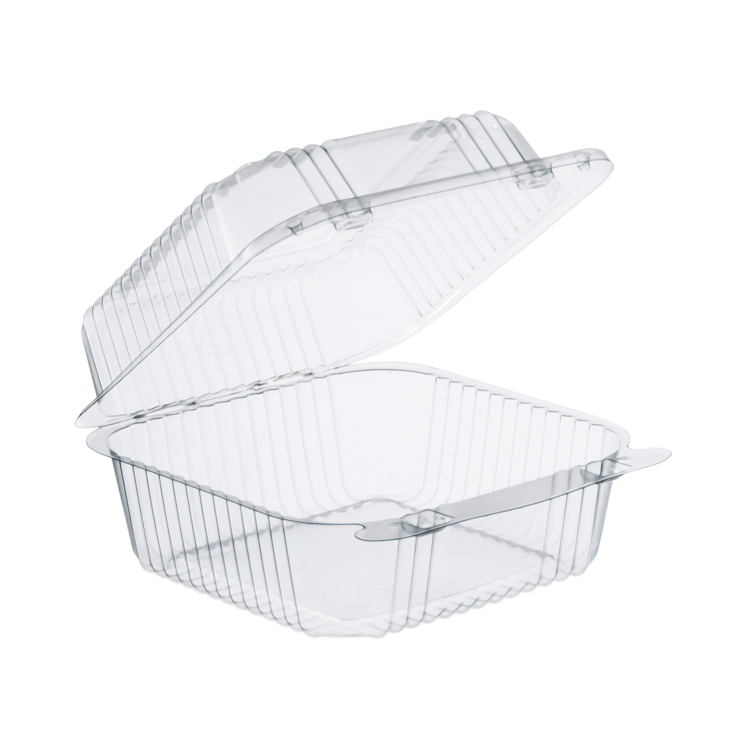 Clear hinged containers offer crystal clarity for excellent product visibility. Dual bar locks ensure a secure closure, even after multiple openings, while sidewall ribbing and chamfered corners increase strength and durability. Lightweight, crush-resistant and stackable. Serve multiple applications. Food Container Type: Hinged Lid Container; Material(s): OPS – Oriented Polystyrene; Material Type: Plastic; Color(s): Clear.