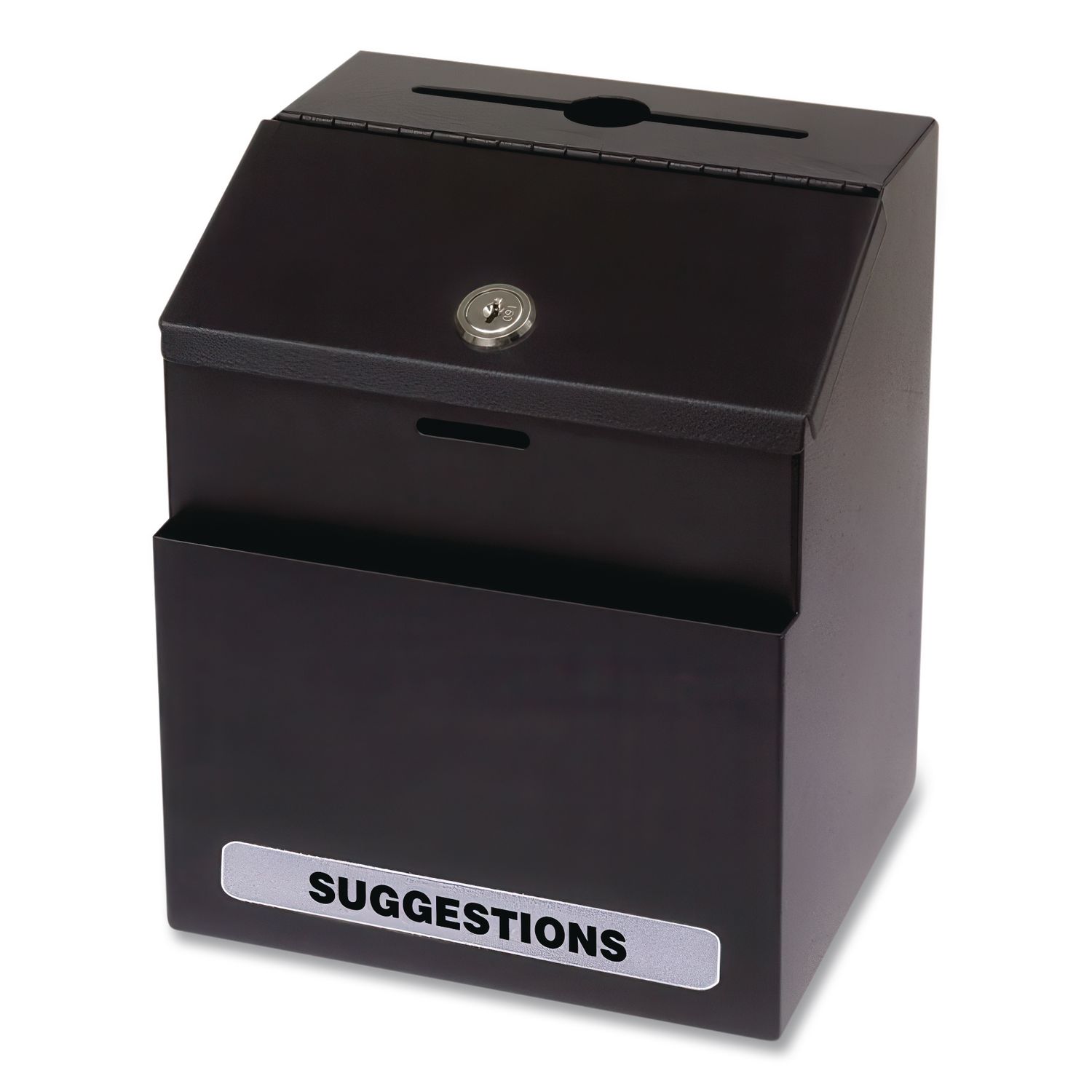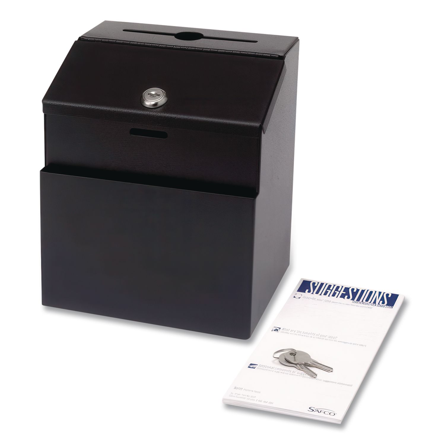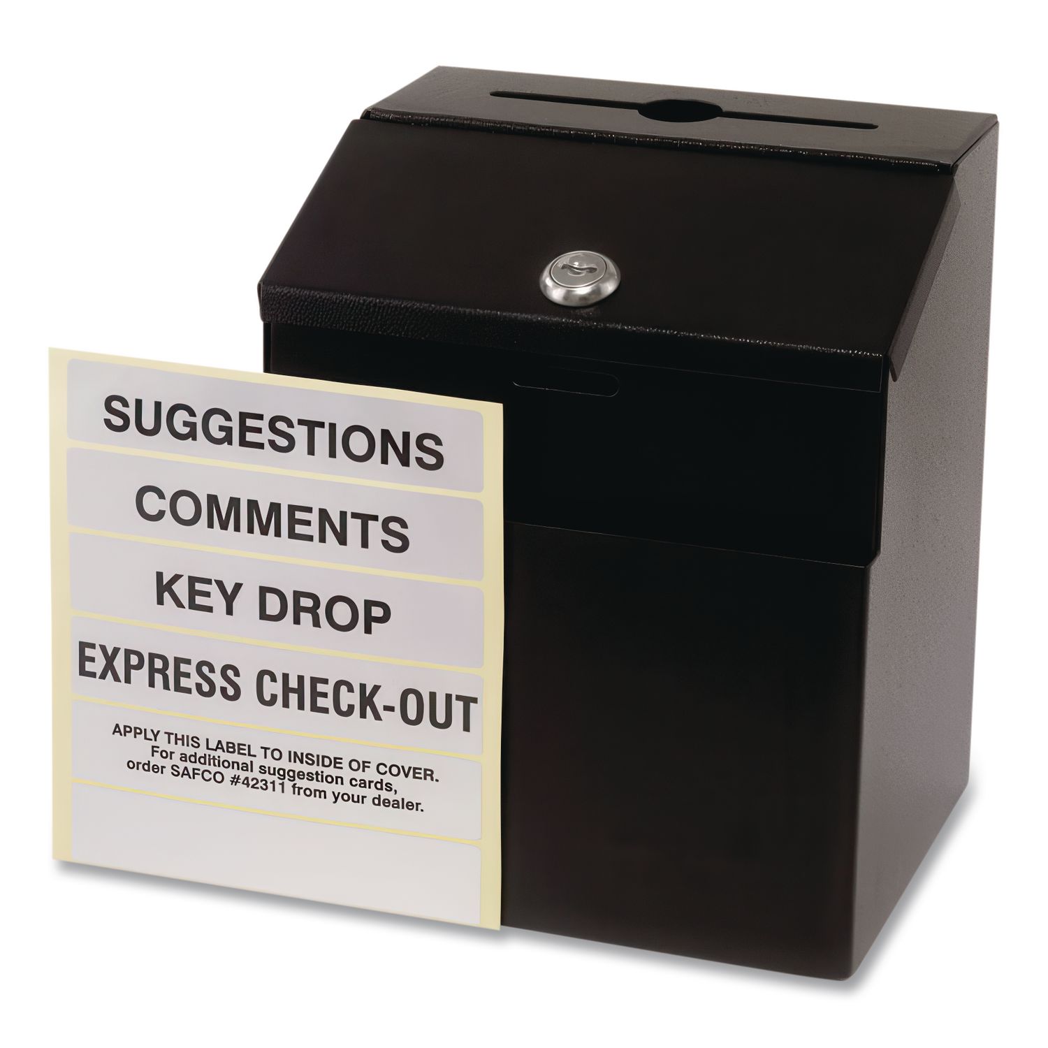 Stick-on labels for specifying use for suggestions, comments or dropping off keys. Front pocket holds supplies for immediate action. Lock secures contents for confidentiality. Color(s): Black; Width: 7″; Height: 8.5″; Depth: 6″.