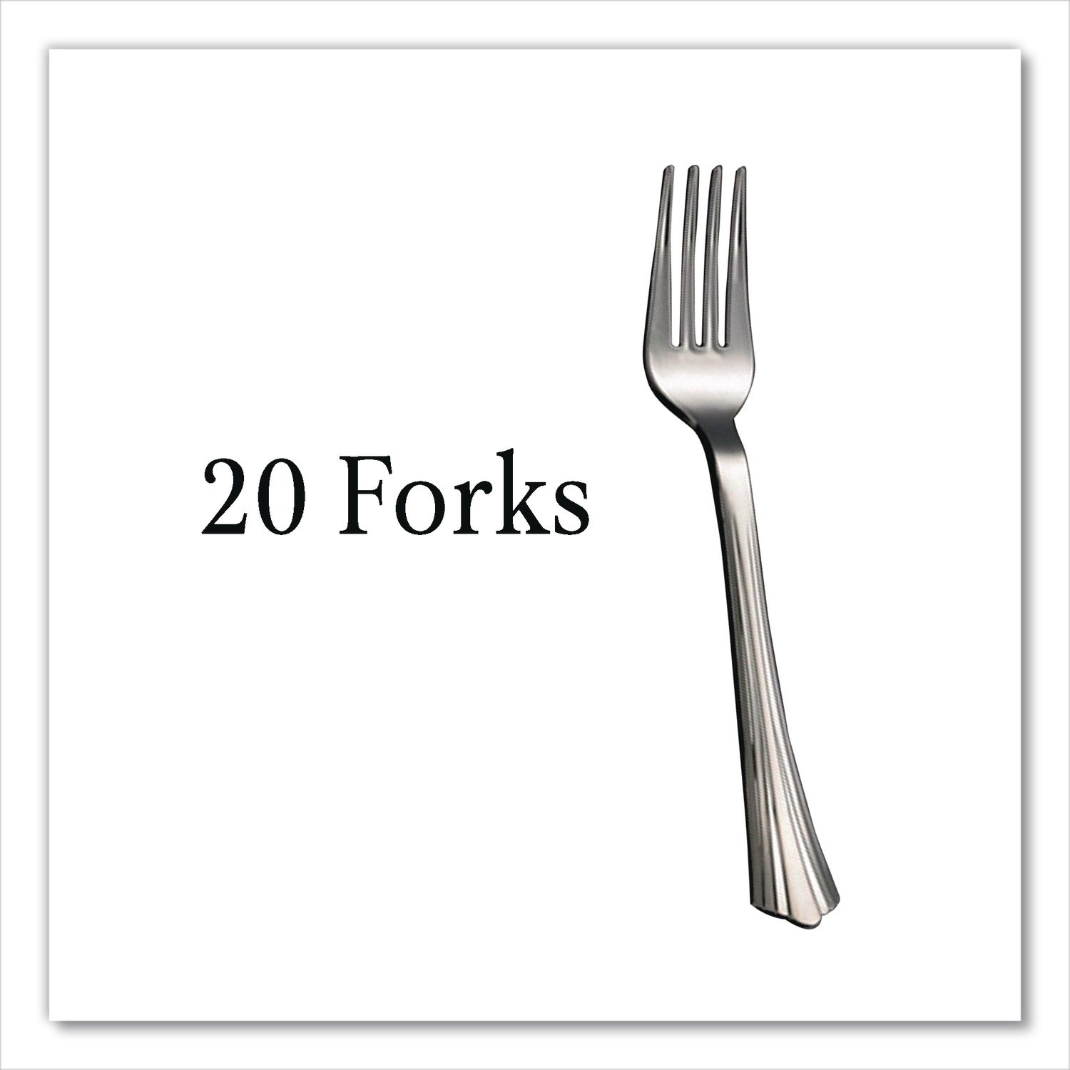 Disposable/reusable plastic cutlery with an elegant look of stainless steel flatware. Includes 20 forks, 15 spoons and 15 knives. Utensils Type: Fork; Knife; Spoon; Material Type: Plastic; Material(s): Plastic; Color(s): Silver.