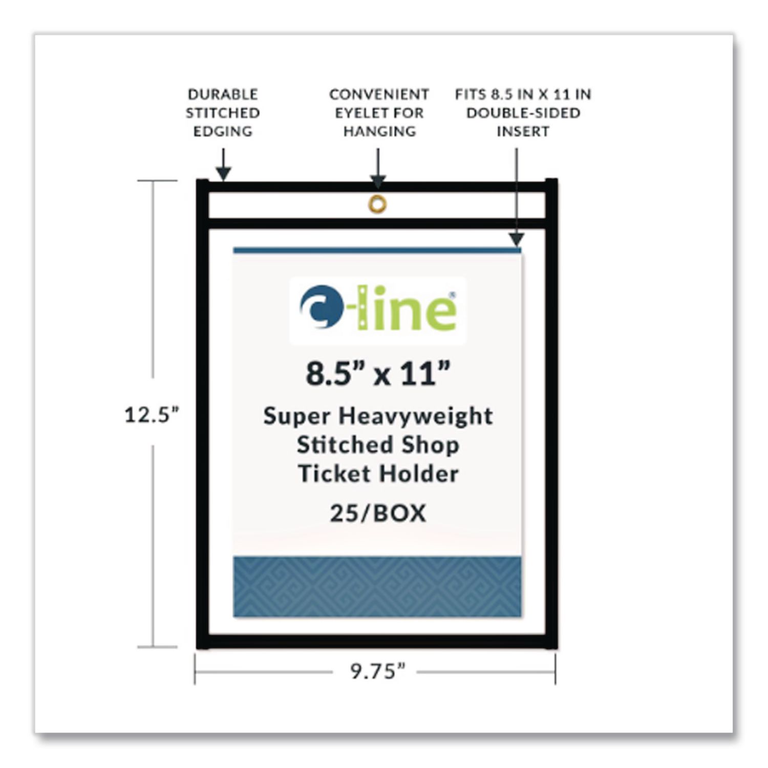 Keep important documents protected. Ideal for rough, industrial environments, super-heavyweight clear vinyl construction and reinforced stitched borders ensure these holders provide the durability required for work orders, production schedules, inventory cards and more. Metal headband grommets make it easy to hang C-LineĀ® Stitched Shop Ticket Holders where they make the most sense for you and your business. This product will be cheerfully replaced with one of equal value if defective in materials, manufacturing or packaging at the time of purchase. Load Orientation: Top; Document Size Range: Letter; Insert Size: 8.5 x 11; Front Face Color: Clear.