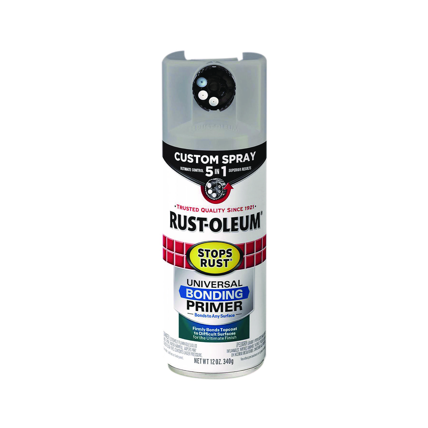 Rust-Oleum Stops Rust Custom Spray 5-in-1 allows you to choose between five different spray patterns for ultimate control and confidence over your next project. The advanced Stops Rust formula provides 30% greater corrosion resistance and color retention compared to original matching Stops Rust colors with standard tip. Ideal for ferrous, nonferrous metal and wood surfaces. Not for use on galvanized metal. Paint Sub-Category: Primer; Intended Application Environment: Interior/Exterior; Color(s): Gray; Color Family: Gray.