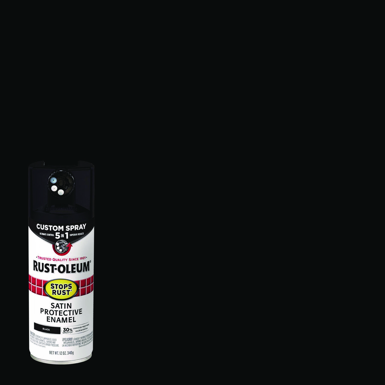 Rust-Oleum Stops Rust Custom Spray 5-in-1 allows you to choose between five different spray patterns for ultimate control and confidence over your next project. The advanced Stops Rust formula provides 30% greater corrosion resistance and color retention compared to original matching Stops Rust colors with standard tip. Ideal for ferrous, nonferrous metal and wood surfaces. Not for use on galvanized metal. Paint Sub-Category: Spray Paint; Intended Application Environment: Interior/Exterior; Finish/Sheen: Satin; Color(s): Black.