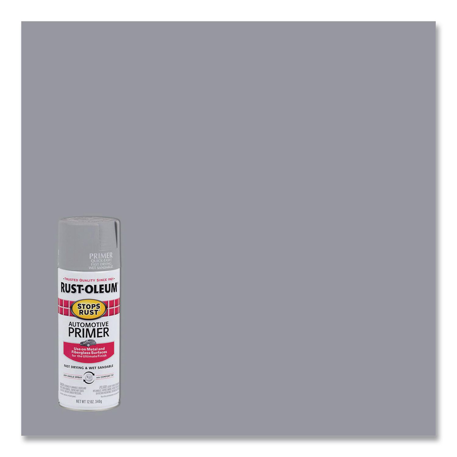 Rust-Oleum Stops Rust Automotive Primer Spray has a fast-drying, rust-preventative formula. Suitable for use on a variety of materials except-galvanized metals, this primer spray has both indoor and outdoor durability. To use, spray on and wait 15 minutes before applying a top coat or wet-sand to achieve an ultra-smooth finish. Paint Sub-Category: Spray Paint; Intended Application Environment: Interior/Exterior; Finish/Sheen: Flat; Color(s): Gray.