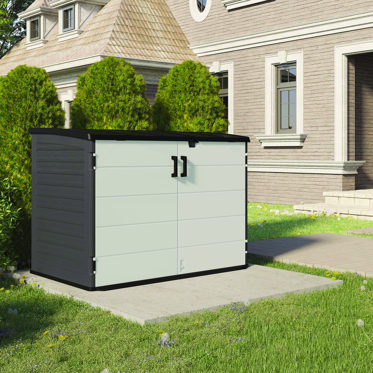 Stow-Away Horizontal Shed, 70 cu ft, 5 ft 10.5″ x 3 ft 8.25″ x 4 ft 4″, Peppercorn/Passive/Black