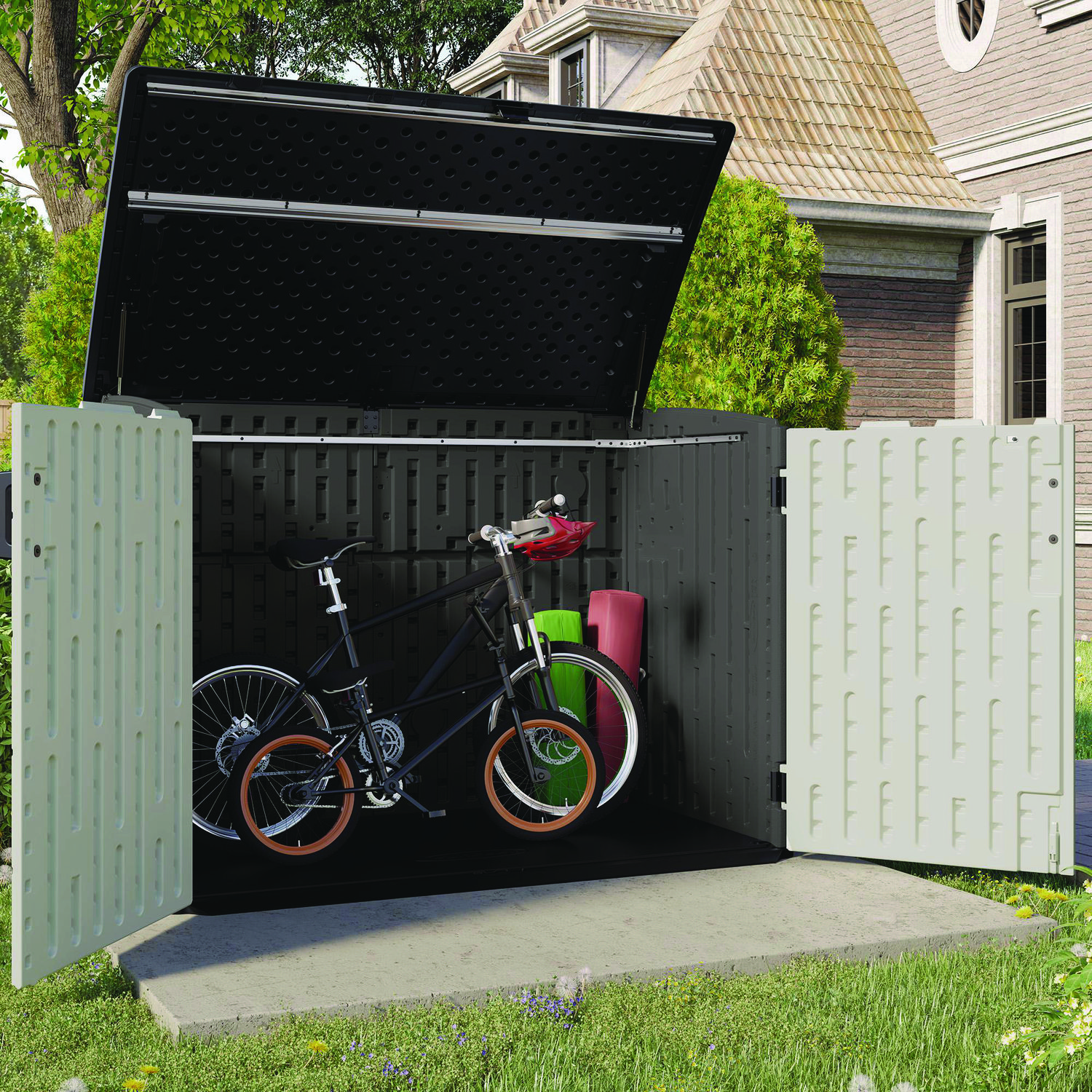 At 70 cu ft, this horizontal shed by Suncast is the perfect solution for hiding your unsightly garbage cans and organizing your lawn and garden equipment. The storage space is sufficient for holding up to two 96-gallon waste containers or it can house other items such as furniture cushions, bicycles, firewood and gardening supplies. Two front-opening doors along with the top-loading lid allow easy access to your items. Gas shocks assist for a one-handed lift operation and ensures that the lid will stay open while in use. Additionally, this horizontal shed has a soft-close hinge that is designed to prevent the lid from closing too quickly or slamming shut. Constructed of steel-reinforced, multi-wall resin, this durable shed is built to withstand the elements throughout any season. Color(s): Peppercorn/Passive/Black; Interior Volume Capacity: 70 cu ft; Material(s): Plastic; Overall Outer Width: 5 ft 10.5″.