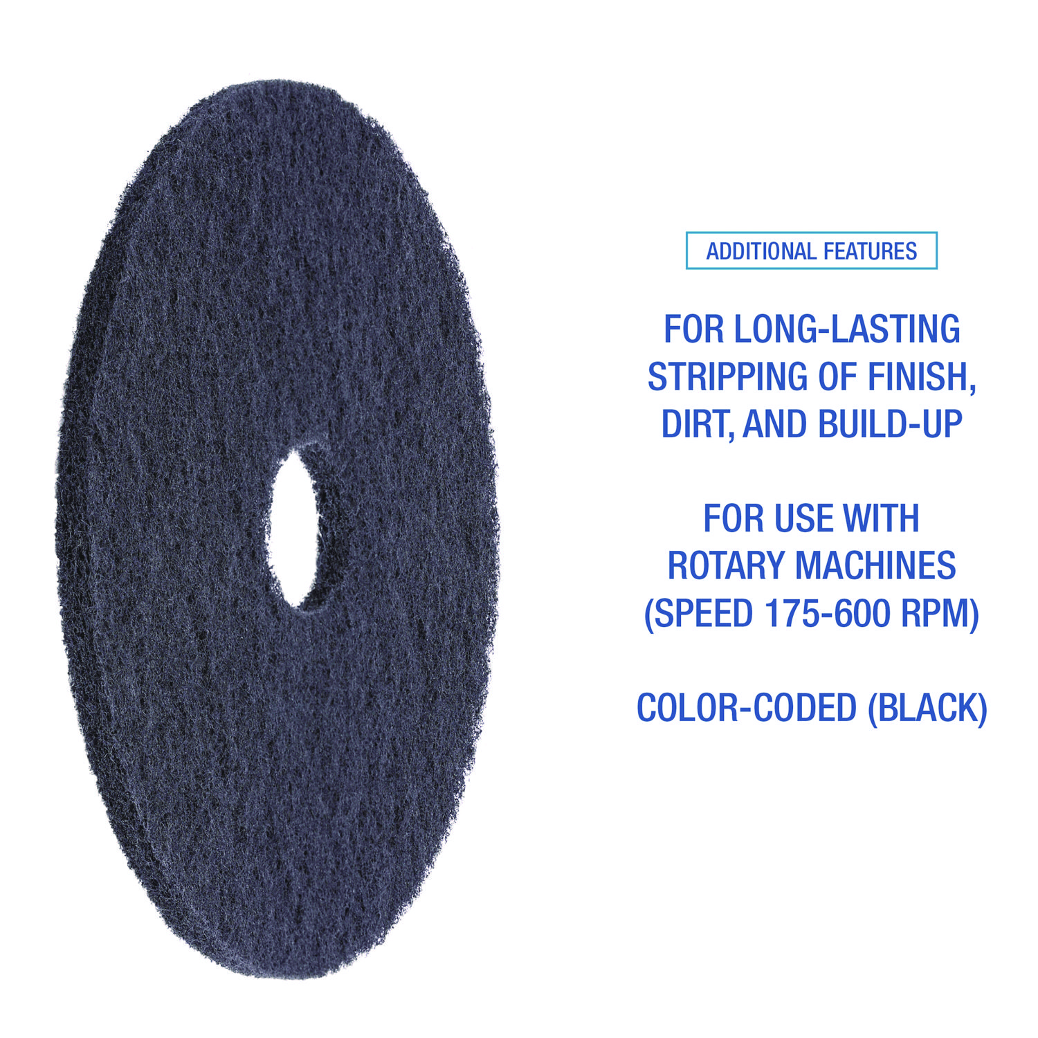 This floor stripping pad is the valuable choice you can rely on for long-lasting stripping of finish, dirt, and buildup. Clean heavily soiled surfaces with ease by using a rotary machine, stripping pad, and appropriate chemicals. The abrasive pad works to remove stubborn stains and finishes. For use with rotary machines (Speed of 175 to 600 RPM). Color-coded for easy job identification. Floor Pads Application: Stripping; Diameter: 15″; Color(s): Black; Color Family: Black.