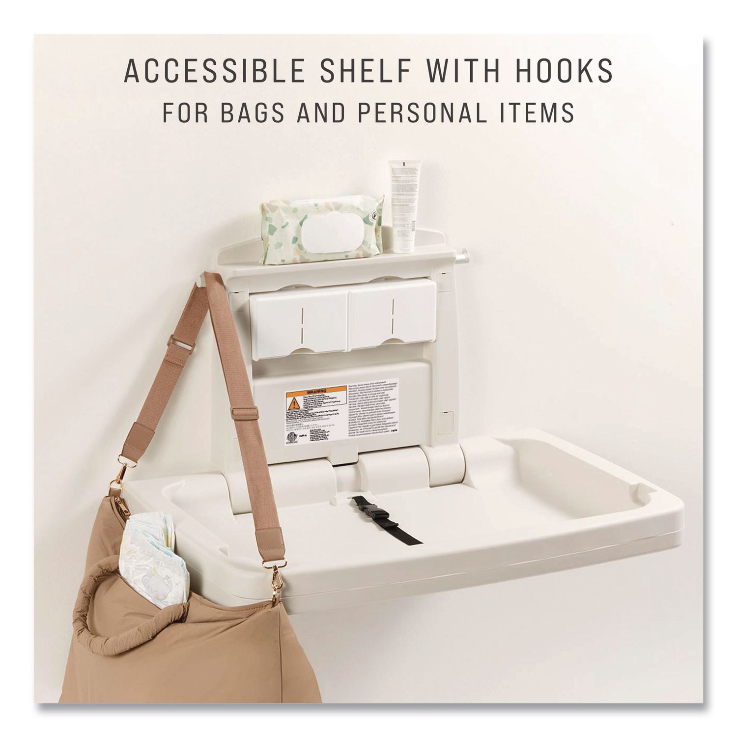 The Rubbermaid Commercial Horizontal Baby Changing Station is designed for commercial environments. Built from high-density polypropylene, this baby changing pad table does not absorb moisture. This baby station meets all global EN, FDA, ADA, and ASTM safety standards. The sturdy station features an accessory shelf to keep items away from baby plus easy reach hooks. The smooth surface makes this changing table easy to clean. Constructed from study materials for durability and antimicrobial product protection. Size (W x L): 33.5″ x 21.5″; Material(s): Plastic; Color(s): Platinum; Folded Depth: 4″.