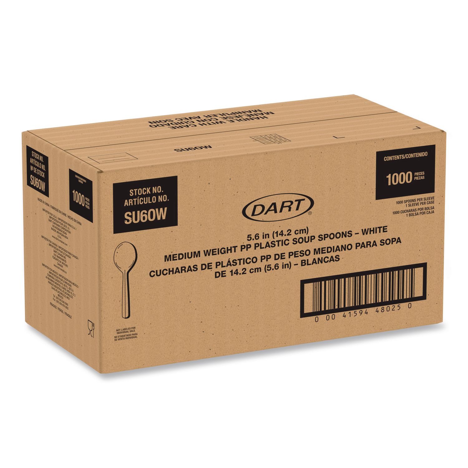 Style Setter® by Dart® is the ideal cutlery line for every day and everywhere! These utensils are lightweight in hand, but hold up hefty meals. These standard-length utensils are a stress-free solution for grab-and-go counters, events and food trucks. Made of durable polypropylene, these are even heat-resistant! Offer your customers the ease and convenience to enjoy meals wherever they want, by providing them with cutlery they can count on. Made of recyclable polypropylene; check locally, may not be recycled in your area. Utensils Type: Soup Spoon; Material Type: Plastic; Material(s): Polypropylene; Color(s): White.