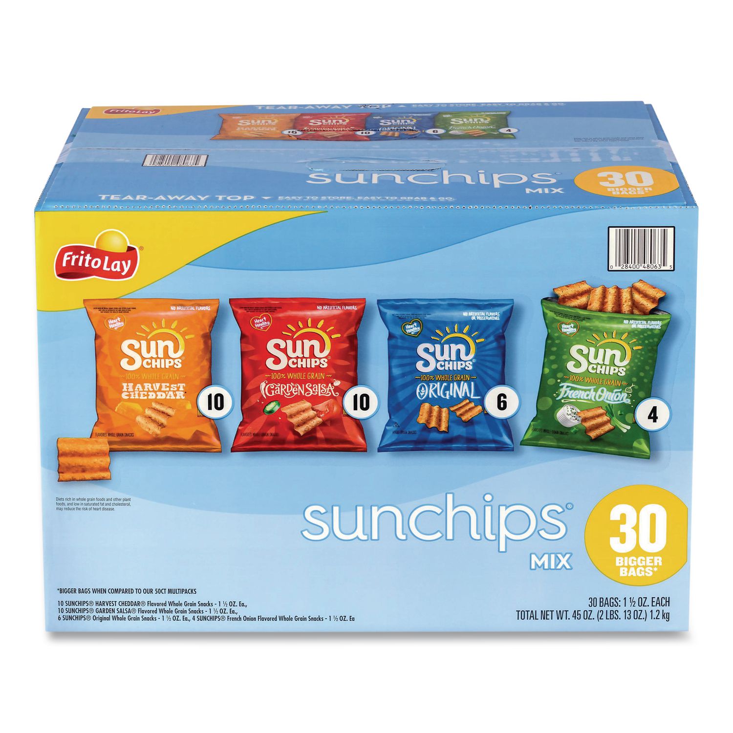 | Package Includes: | (30) 1.5 oz Bags Sunchips: (10) Harvest Cheddar®; (10) Garden Salsa®; (6) Original; (4) French Onion; (9) 0.9 oz Jack Link's Beef Jerky Snack Packs: (5) Original; (4) Teriyaki |