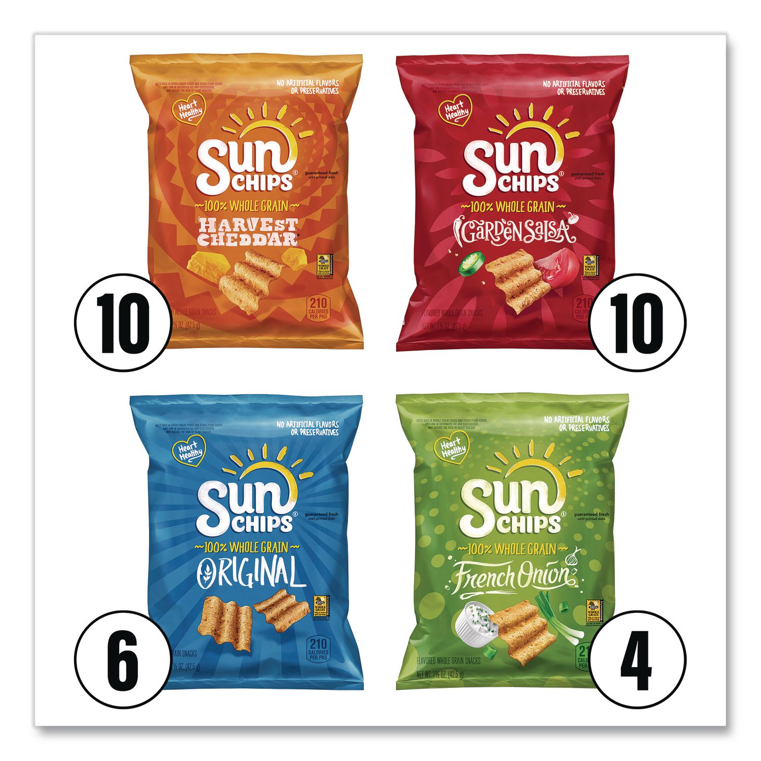 | Flavor: | Sunchips: (10) Harvest Cheddar®; (10) Garden Salsa®; (6) Original; (4) French Onion; Jack Links: (5) Original; (4) Teriyaki |