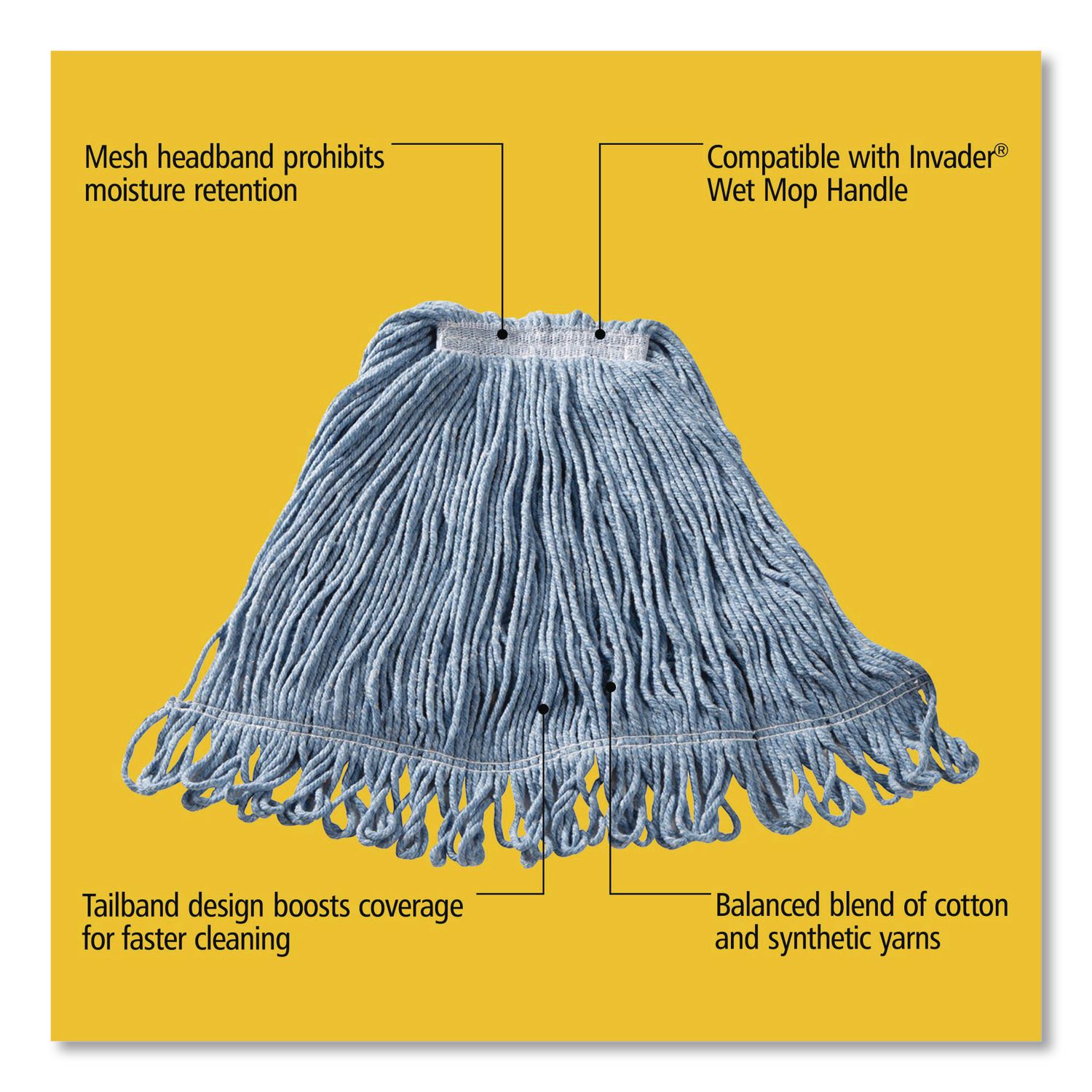 The Rubbermaid® Commercial Super Stitch Blend Mop has a blend of 4-ply cotton and synthetic fibers for higher absorbency and more launderings than cotton mops, and has looped ends and a yarn tailband to reduce tangling and fraying for improved performance. The synthetic mesh headband resists moisture retention so the mop head can dry between uses. Color-coded to help minimize cross-contamination. These mop heads are suitable for use in commercial and industrial applications. Mop Head Type: Wet Mop; Application: Floor Maintenance; Mop Head Style: Looped End; Mop Head Size: Medium.