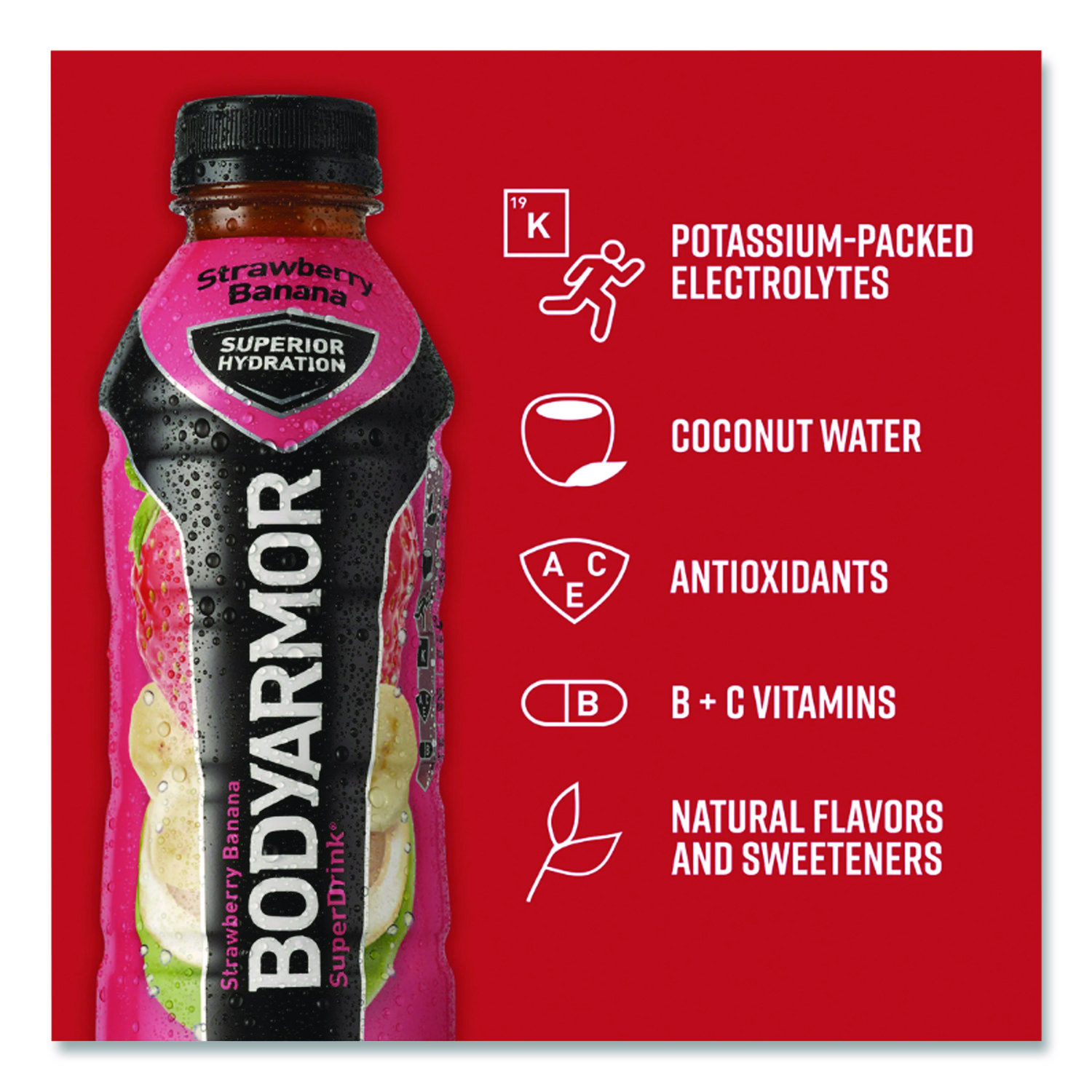 BodyArmor is a premium sports drink that provides superior hydration. It is packed with electrolytes, coconut water, and vitamins and is low in sodium and high in potassium. Beverage Type: Flavored Sports Drink; Flavor: Strawberry Banana; Product Packaging: Bottle; Volume Capacity: 16 oz.