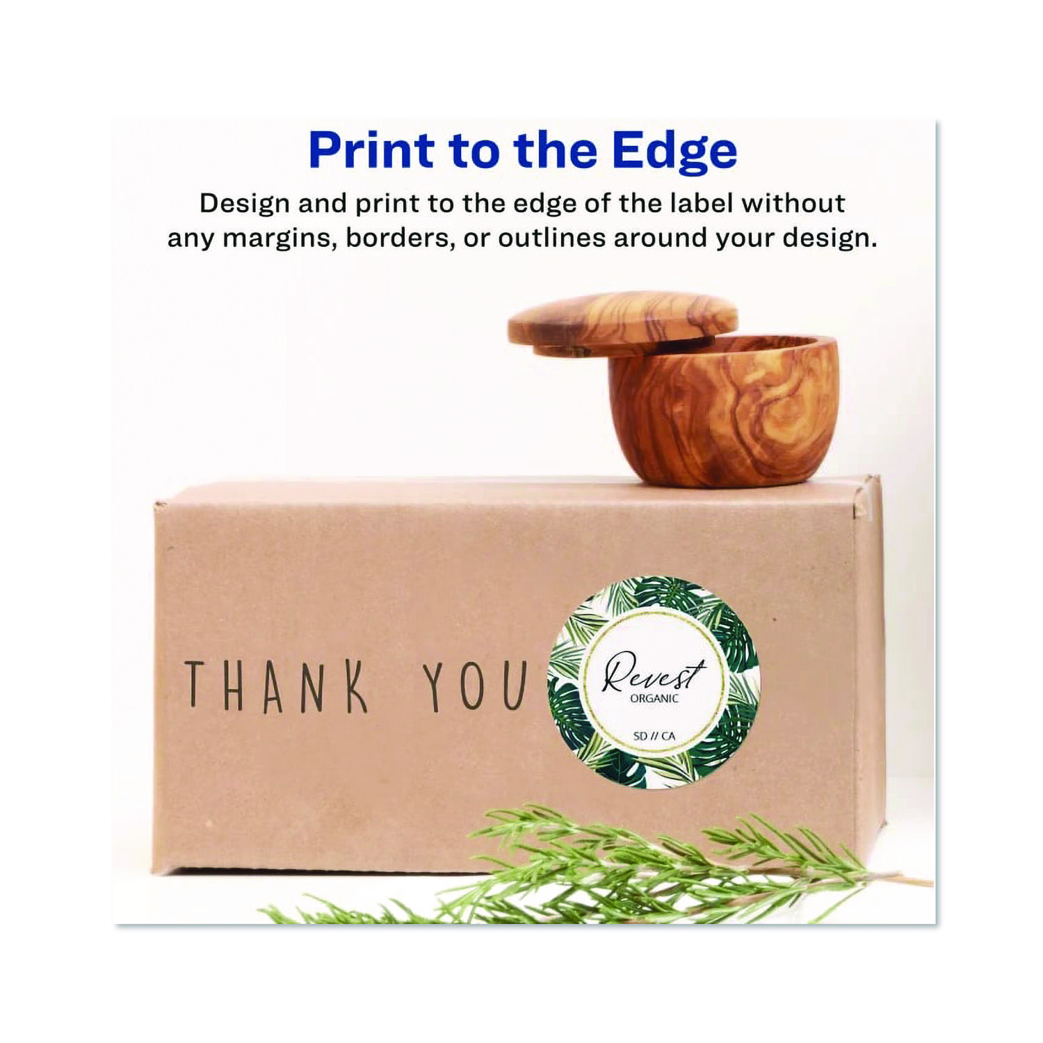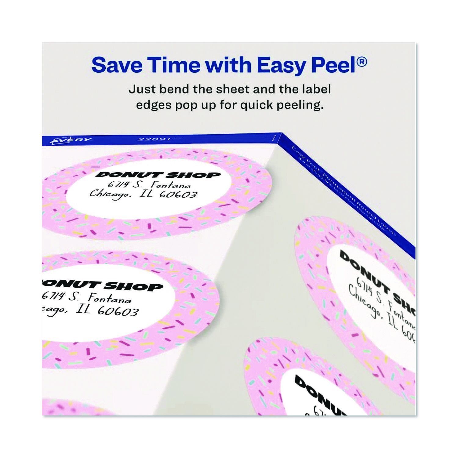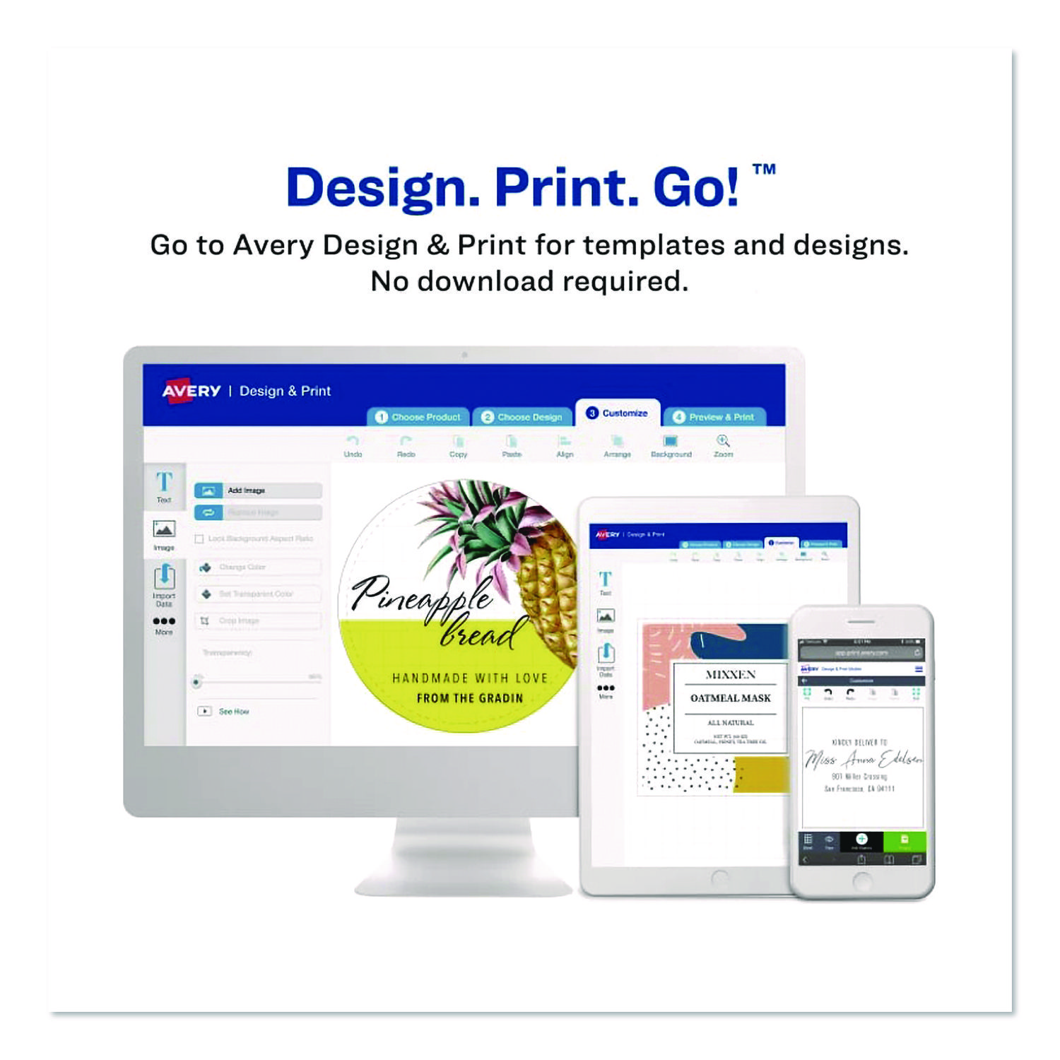 Make sure your handmade gifts and products stand out with Avery® glossy labels that offer the professional finishing touch you need. Glossy Avery® labels feature a beautiful photo-quality shine that adds an elegant glimmer to candle labels, lotion labels, soap labels and more. Create your own unique designs with hundreds of customizable Avery® templates. These glossy labels also feature exclusive Avery® Sure Feed® technology to improve print alignment and avoid jamming. The blue, textured strip on the top of each sheet provides better grip for printer rollers and helps feed the sheet through your printer. The patented Easy Peel® label design makes these labels easy to peel and quick to apply. Just bend the label sheet, peel off your labels and fold the sheet back flat. The permanent adhesive ensures that your labels stick and stay without curling, peeling or falling off. Smudge-proof when used with inkjet and laser printers. Shape: Round; Label Size – text: 3″ dia; Label Color(s): White; Color Family: White.
