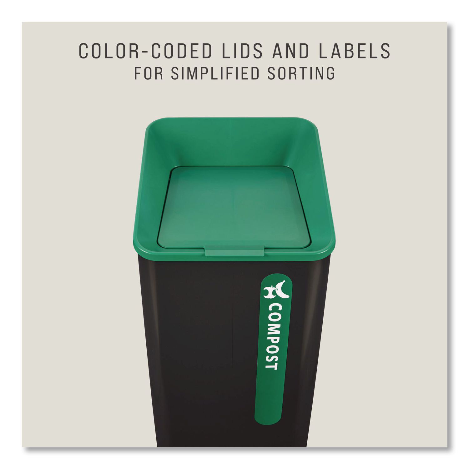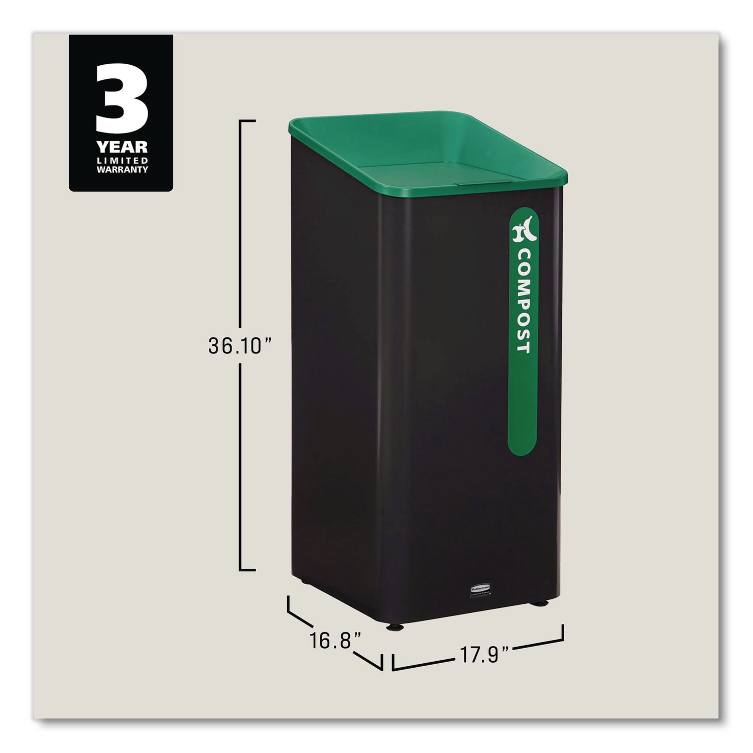 Rubbermaid Commercial Products Sustain Containers are a decorative and adaptable recycling solution made to improve your facility’s sustainability compliance. Modular system allows the container stations to be customized and grow with each recycling program’s needs. Restrictive waste stream openings and colored labels provide easy visual cues for patrons, making recycling easier and improving compliance with growing regulations. Compost. Waste Receptacle Type: Indoor Recycling Bin; Material(s): Metal; Plastic; Application: Indoor Recycling; Interior Volume Capacity: 23 gal.