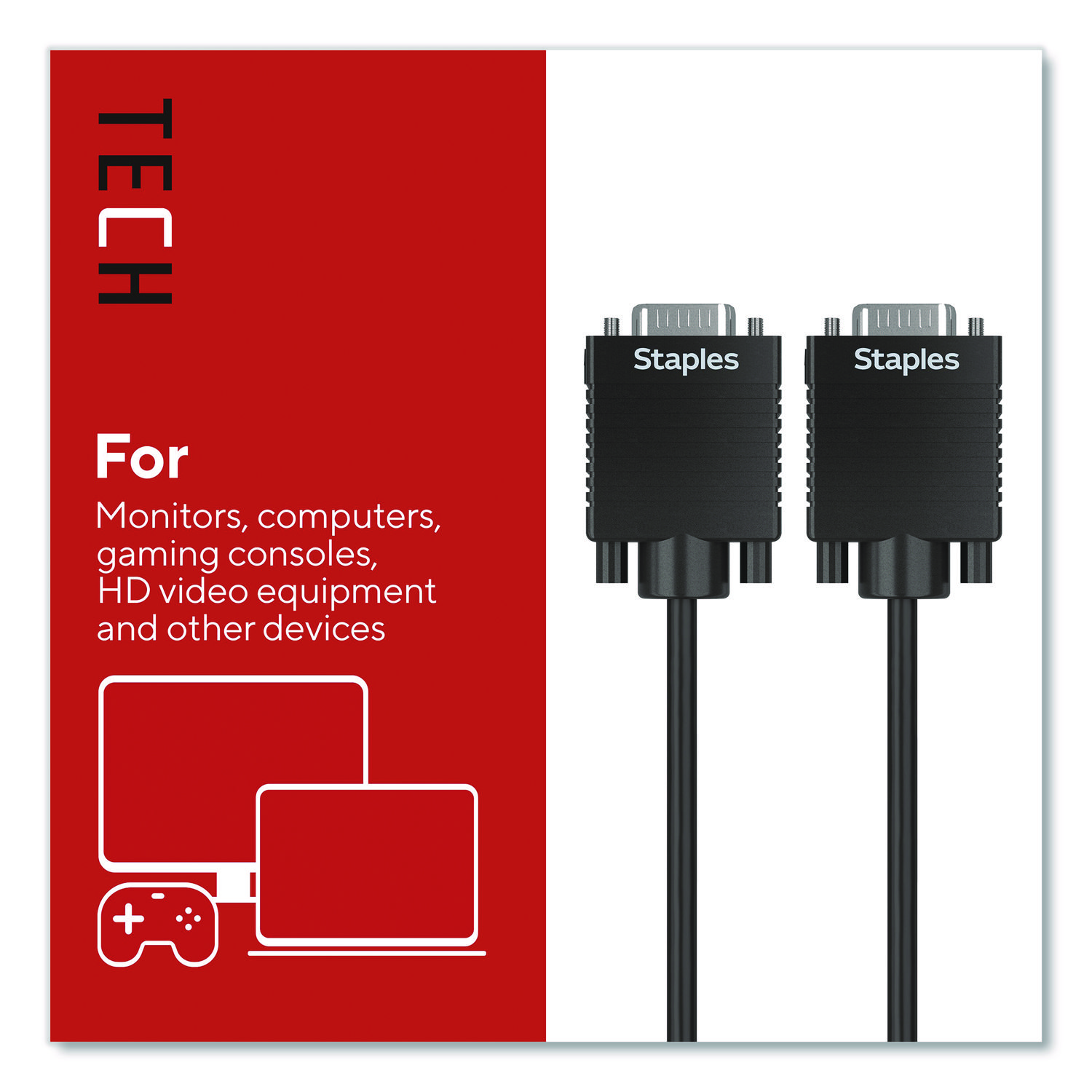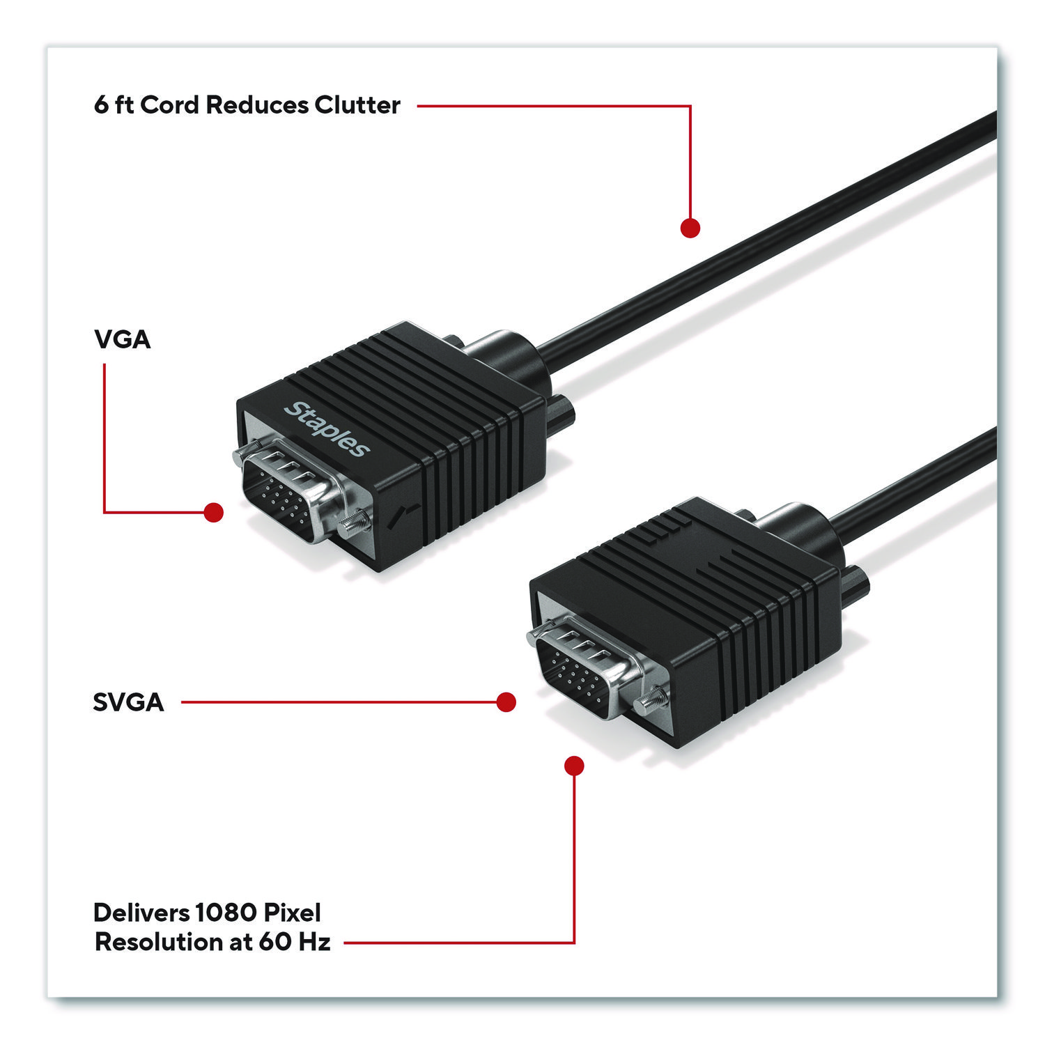 For work or entertainment an extra, larger display often comes in handy. With the Staples TECH VGA cable, you can connect additional monitors, displays, gaming consoles, projectors and more. Delivering a clear 1080 pixel resolution, this cable promises clear video for an exceptional experience. It provides ample length to connect devices across your workspace while also reducing cord clutter. This cable is the perfect choice for outfitting your work, gaming or entertainment space. Enjoy quality video so you can upgrade your home or office workspace and do your best work. Cable Type: SVGA Cable; Connector/Port/Interface: SVGA Male; VGA Male; Cable Length: 6 ft; Jacket Color: Black.