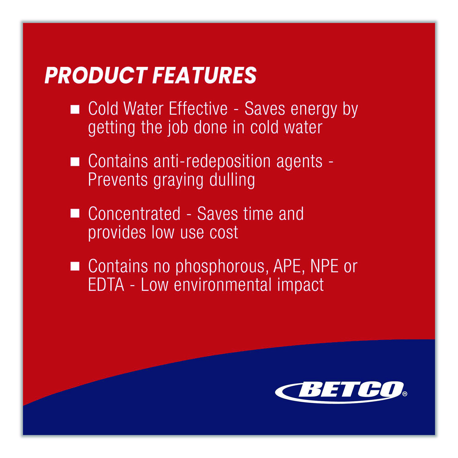 Concentrated synthetic detergent with powerful surfactants and anti-redeposition agents that release and suspend even heavy soils from the linen preventing graying and dulling and leaving linen fresh and white. Detergent delivers one wash clean at a low end use cost. Designed to be used as a standalone detergent or with Break for the worst soils and stains. Detergent is safe on all water washable fabrics in hot or cold water. Application: Laundry Detergent; Applicable Material: Fabric; Chemical Compound: Sodium Dodecylbenzenesulfonate; Dirt Types: Dirt; Soil; Stains.