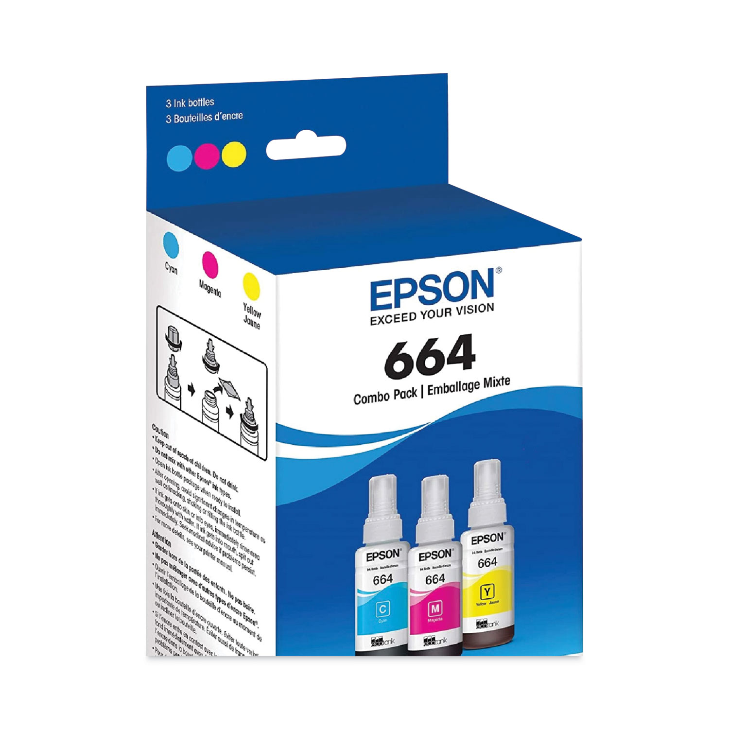 Create up to 4,000 more prints with your EcoTank-series printer by refilling with these 70 mL T664 Ink Bottles from Epson. Designed to make refills simple and less common, these bottles offer exceptionally high print yields compared to standard cartridges. They also have the advantage of reduced cost. Additionally, this model features a Sensormatic sensor for assisting organizations in tracking usage. Device Types: Inkjet Printer; Color(s): Cyan; Magenta; Yellow; Supply Type: Ink; Market Indicator (Cartridge Number): 664.