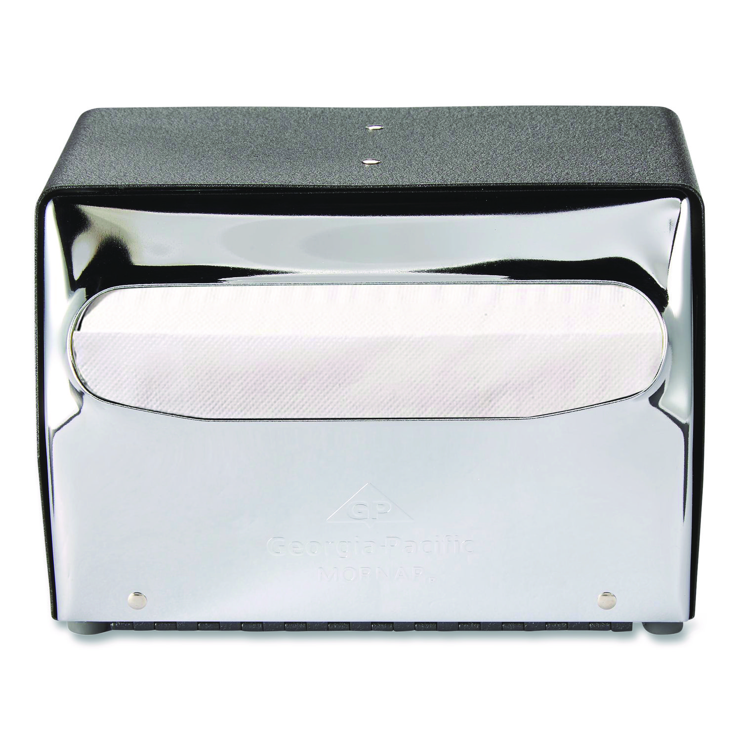 Attractive napkin dispenser offers convenient one-at-a-time dispensing for reduced usage and provides a more hygienic operation. Helps prevent waste ensuring customers take only what they need. Dispenser holds more than one full pack of napkins so the dispenser can be refilled with a full pack before empty. One-at-a-time dispensing reduces usage and helps provide a more hygienic operation. Color(s): Black/Chrome; Width: 7.5″; Depth: 6″; Height: 5.37″.