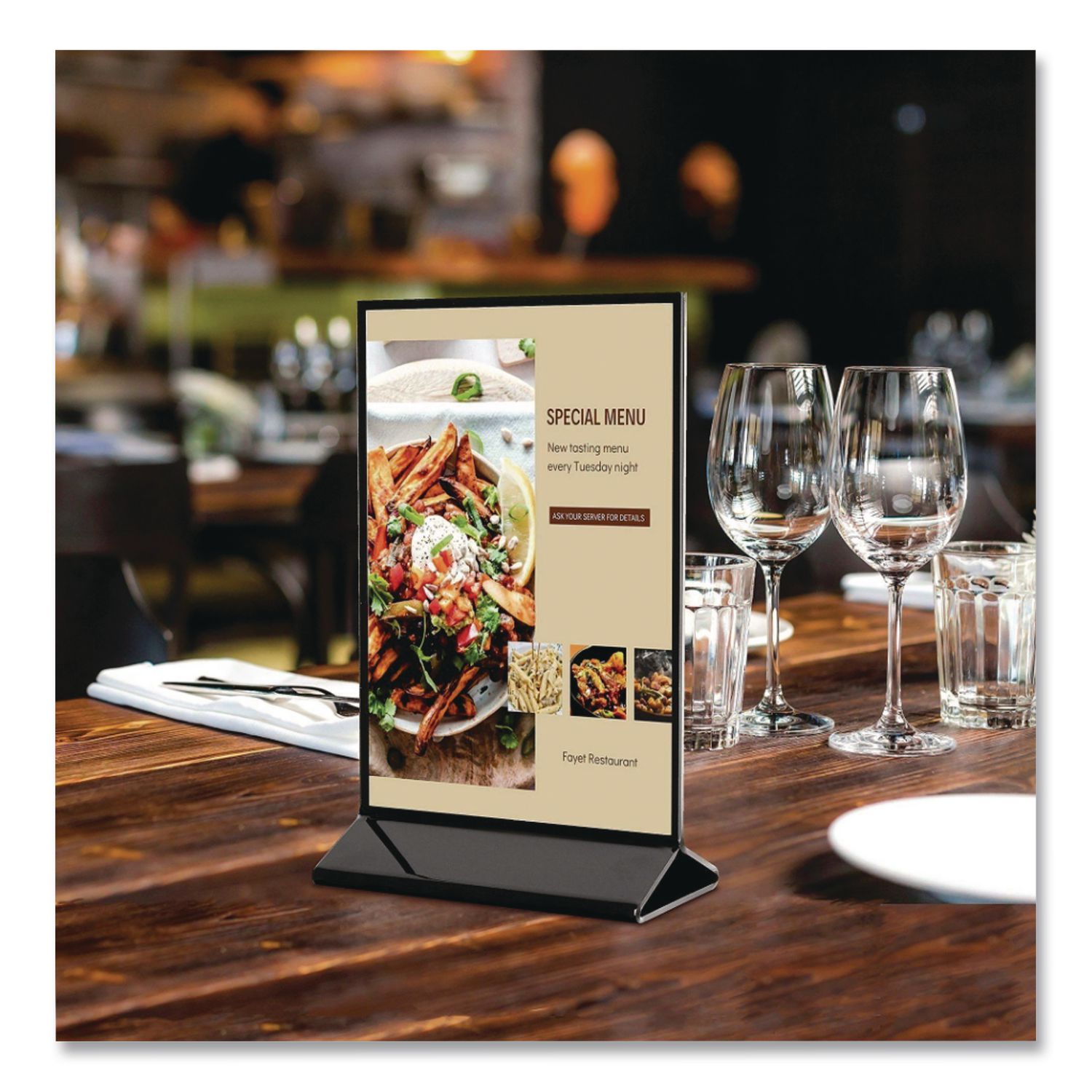 Perfectly designed and sized for all your restaurant, foodservice and hospitality needs, this freestanding sign and menu holder showcases your menus, daily specials or other messages through the clear front panels, offering full visibility. Signs can be viewed from both sides to maximize your display capabilities. Face Color(s): Clear; Frame Color: Black; Insert Size: 5″ x 7″; Material(s): Plastic.