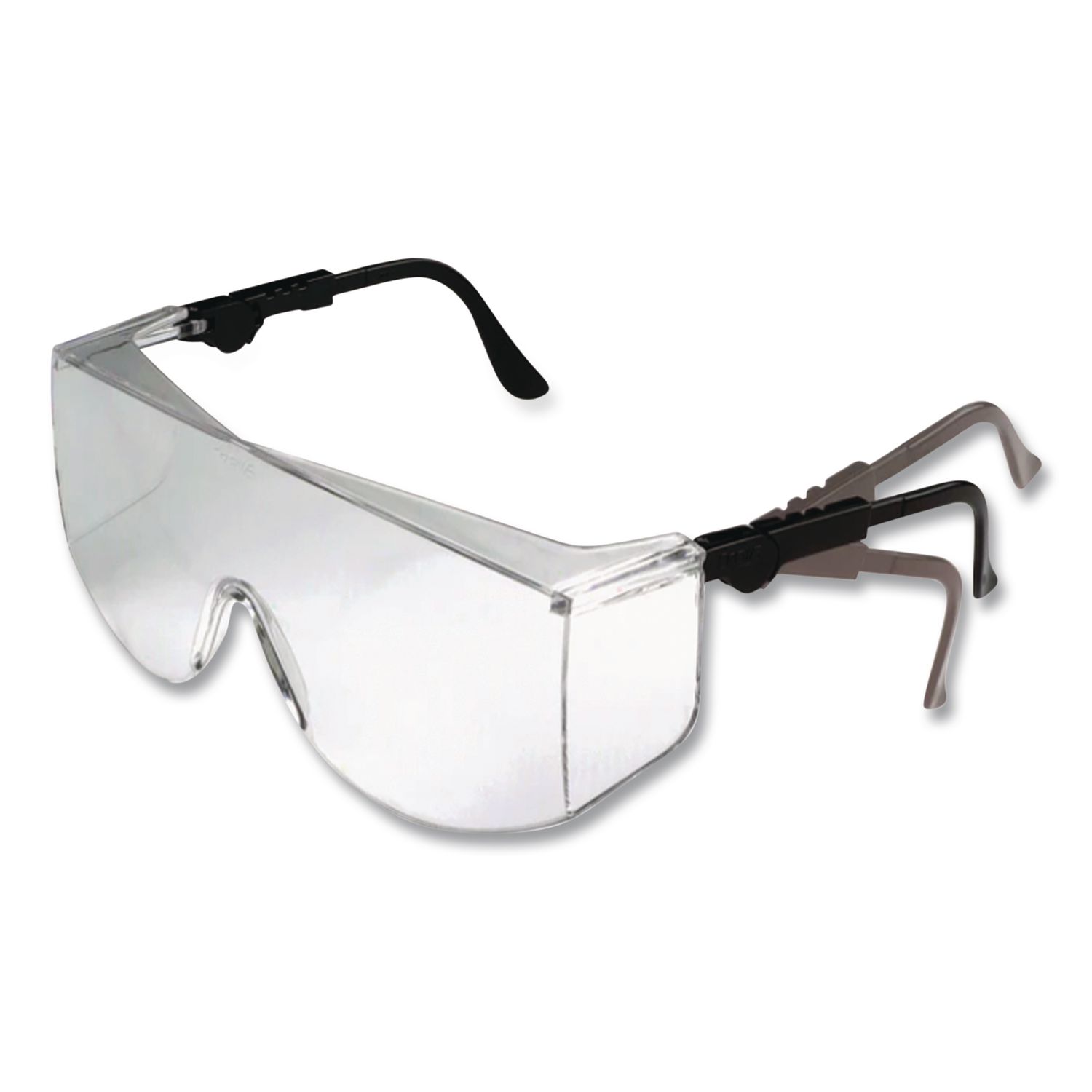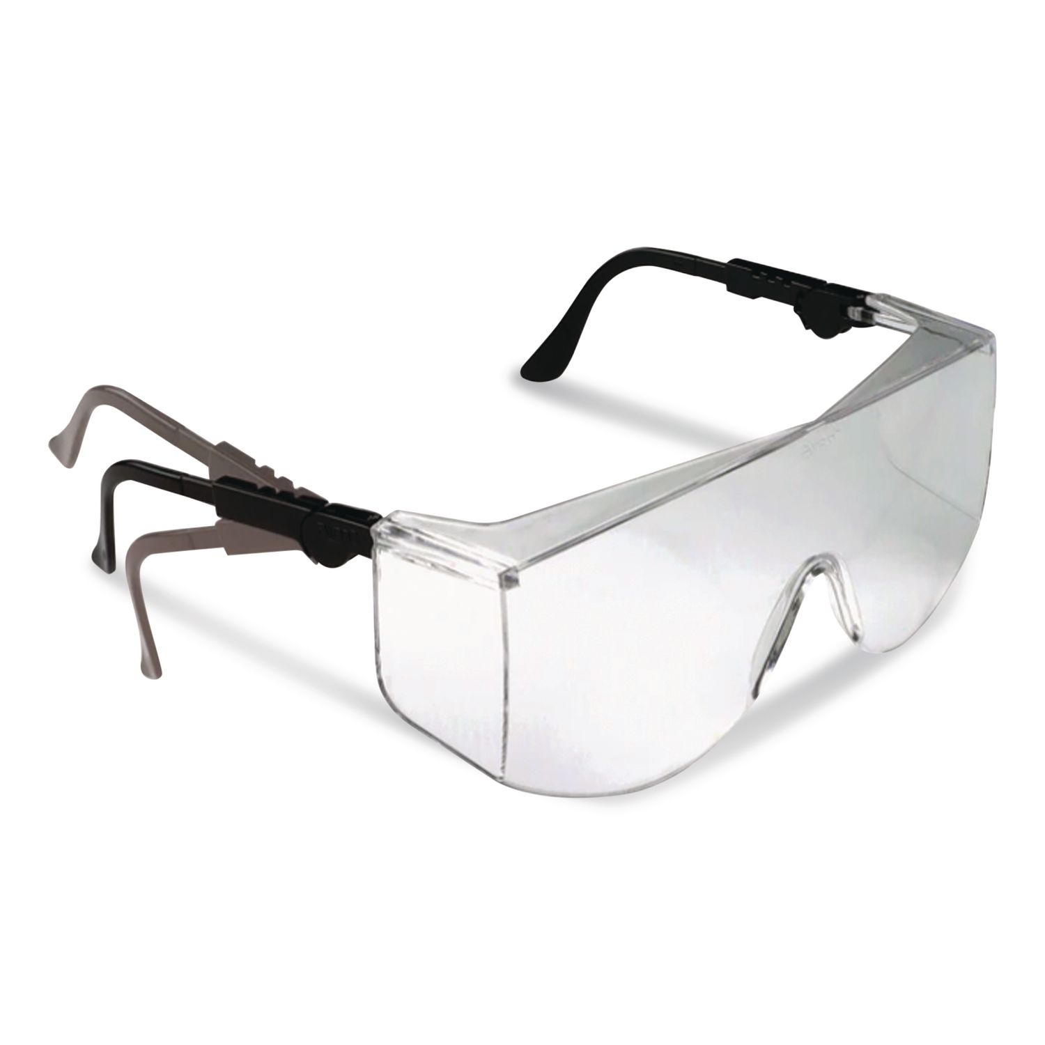 No frills, effective safety glasses. Made of a durable, lightweight, scratch-resistant polycarbonate, the one piece wraparound lens provides a wide field of vision and reliable protection. The Duramass® scratch-resistant coating minimizes the damage of desktop falls, laboratory mishaps and construction site wear and tear. Safety Glasses Style: Frameless; Arm Color: Black; Frame/Arm Material: Nylon; Lens Style: Single Lens.