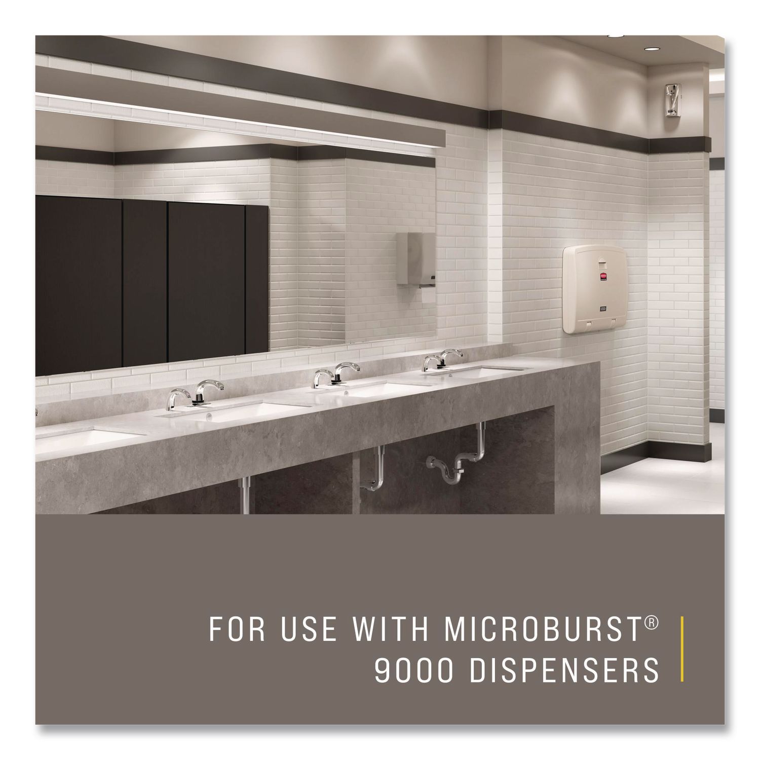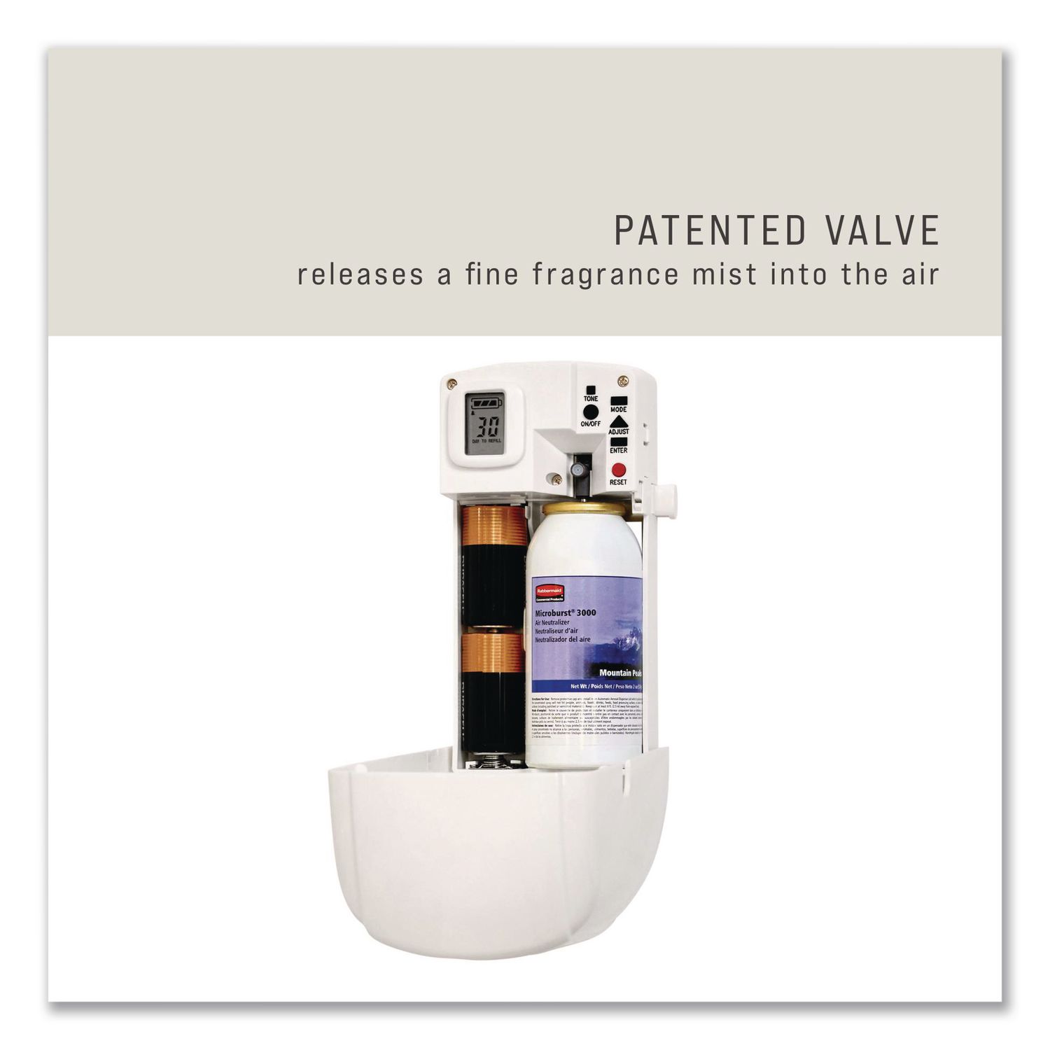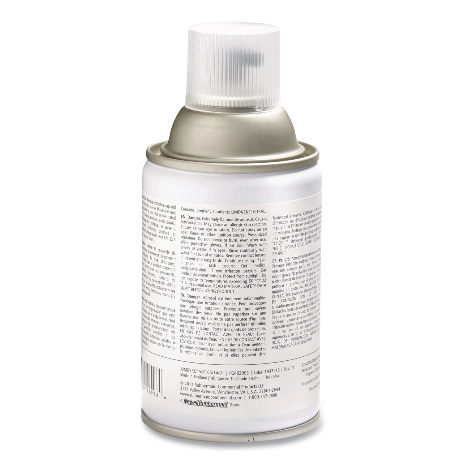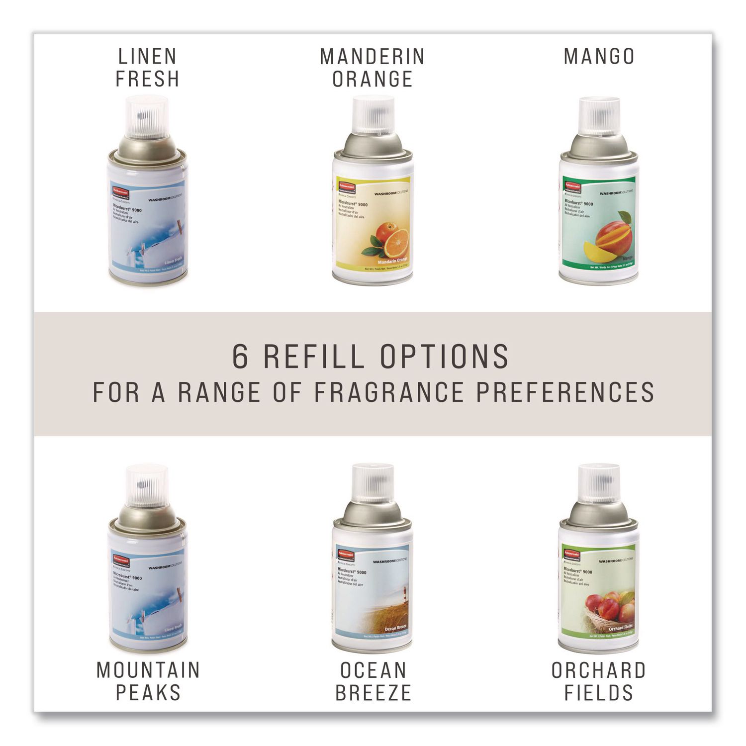 Refreshes any washroom with an invigorating scent. This commercial air freshener refill offers 90 to 180 days of maximum odor control distributed in a fine dry mist with 63% fewer VOCs per spray than standard aerosol refills. For use with the Rubbermaid Commercial Microburst 9000 Aerosol Air Freshener dispenser (sold separately). Scent: Mandarin Orange; Physical Form: Liquid; Application: Automatic Odor Control; Volume Capacity: 5.3 oz.