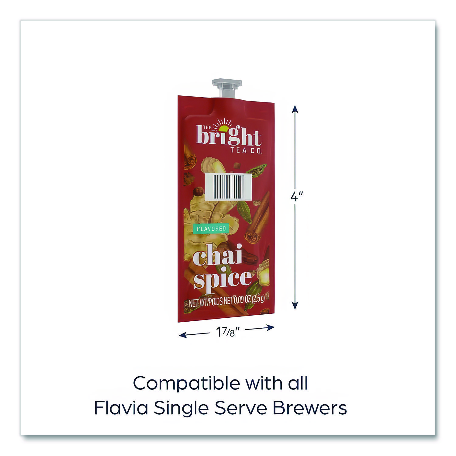 Each pod is filled with loose tea to ensure a perfect cup. Makes 8 to 12 oz, depending on personal preferences. Innovative design ensures that no flavors linger from one cup to the next. Chai Spice—Perfect blend of ginger, cinnamon, black pepper, cardamom and black tea. Beverage Type: Tea; Flavor: Chai Spice; Product Packaging: Flavia® Freshpack Pod; Capacity (Weight): 0.09 oz.